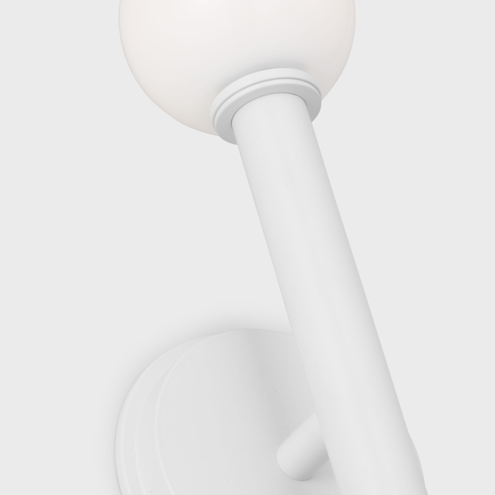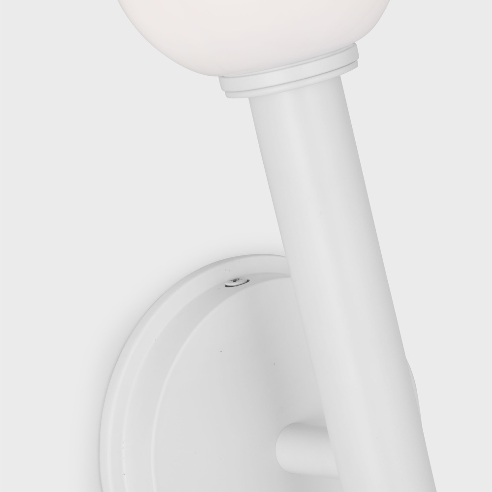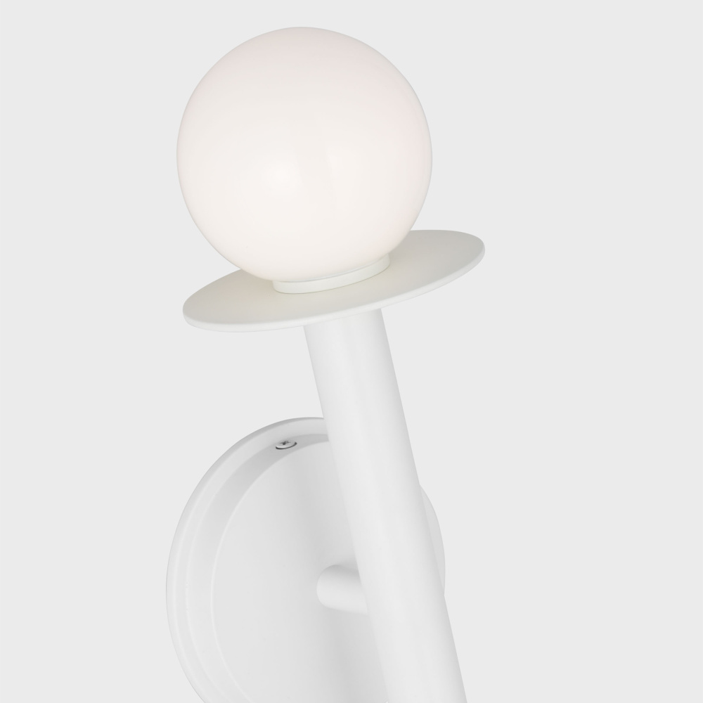 Nodes task, ceiling and wall lighting is minimal yet bold, highlighting Kelly's distinctive juxtaposition of mixed-materiality and curvilinear form. Light radiates from milk glass globes set against metal discs. All fixtures can be used or without the discs. The cast canopy is available in modern finishes. Hanging fixtures within this family feature black fabric cords, while pivot sconces can be cord and plug or hard wire.