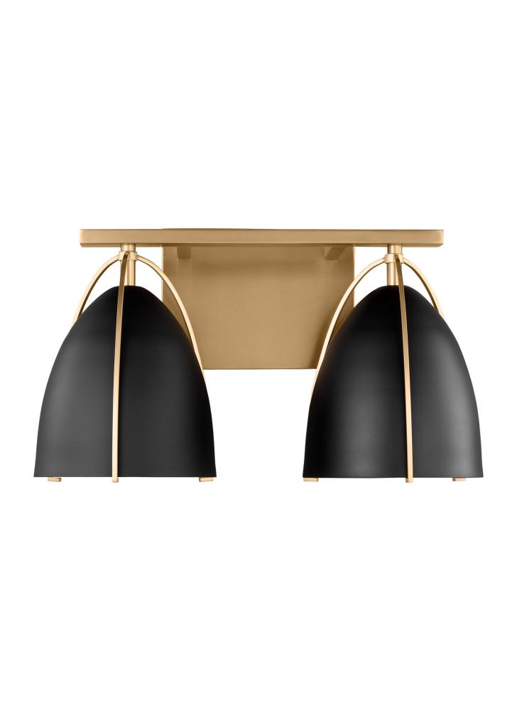 The Norman two light vanity fixture in satin brass offers shadow-free lighting in your powder room, spa, or master bath room.