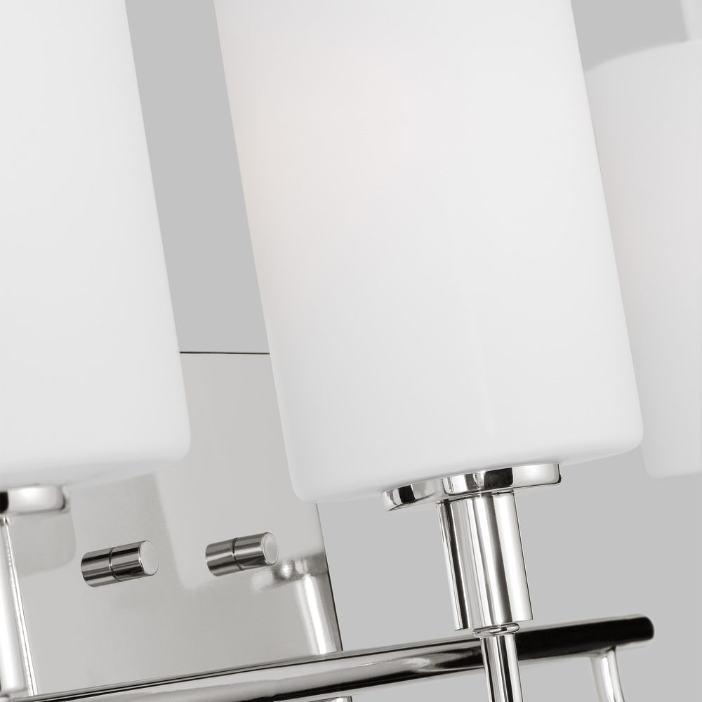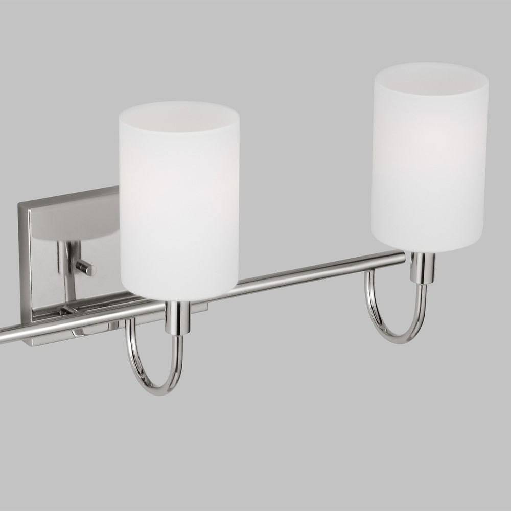 Oak Moore is a universal vanity series available in four finishes. Curved bar detail and etched white shade give it a transitional look. Install the light with glass shades up or down to light up every corner of your room. The shades are made of Etched White glass to cast a soft light throughout your vanity area.