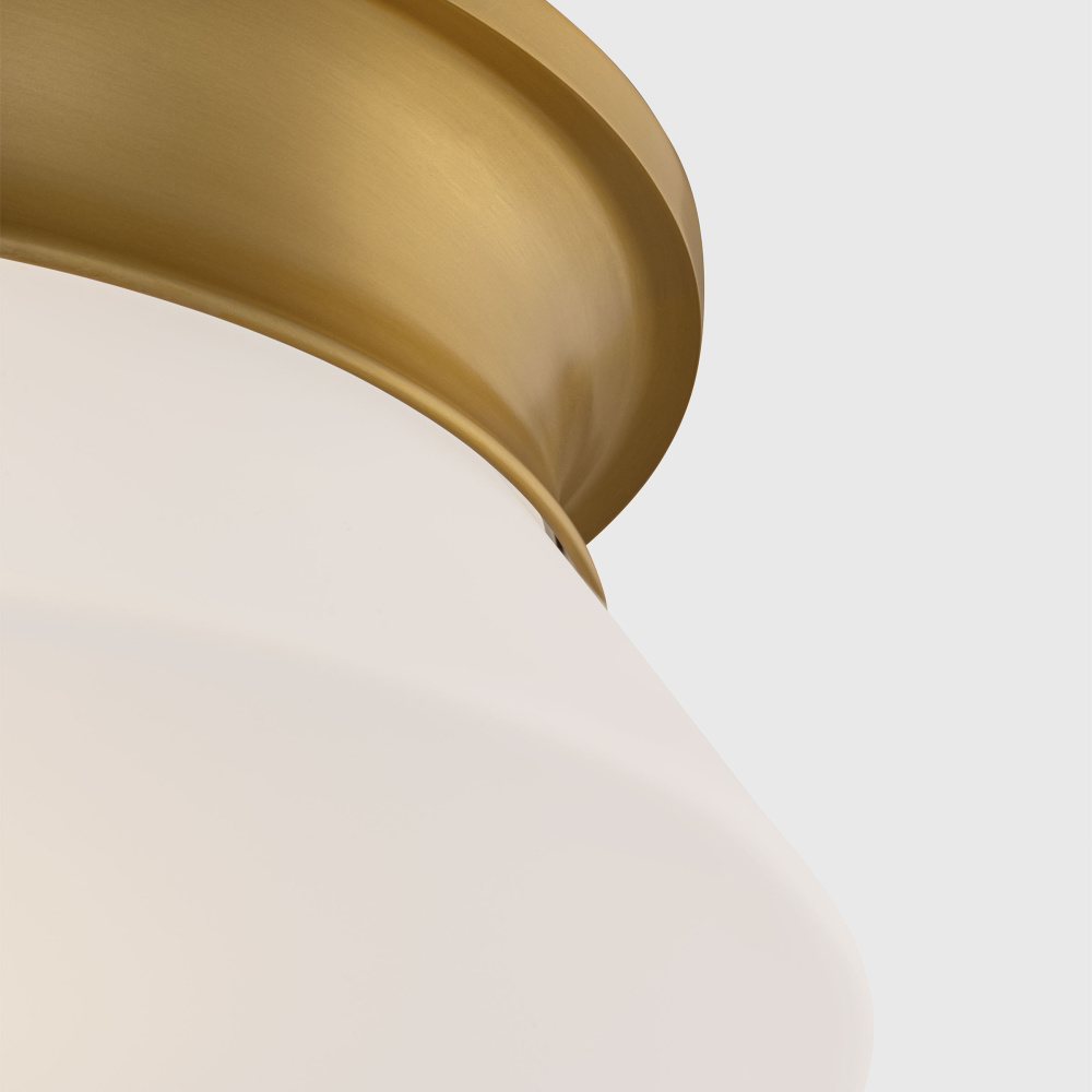 A flared conical form takes center stage in the Panos flush mount by Alexa Hampton. The harmony of proportions between the signature metal band and white glass diffuser highlights traditional elements with modern detail. The versatile Panos flush mount will complement any interior aesthetic and can be styled over a dining table, entryway, in a bedroom or lining a corridor.
