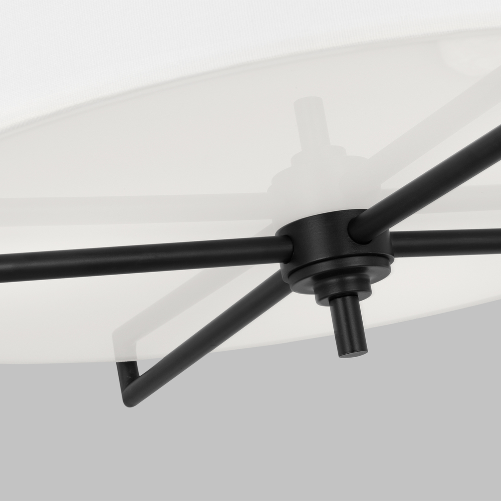 The Perno three-light flush mount in Aged Iron by Chapman and Myers was inspired by a vintage mid-century French sconce with a simple metal armature. The minimal cruciform structure of the metal frame is the main feature of the design. The frame outlines and supports the inner cylindrical shade. All of the assembly hardware for installing the inner shade was engineered to be hidden in order to maintain the clean and simple aesthetic of the light.