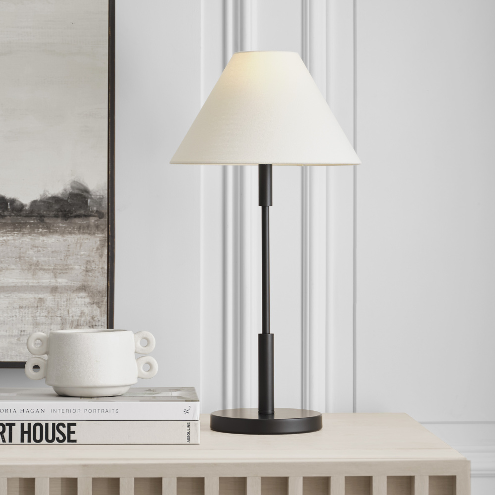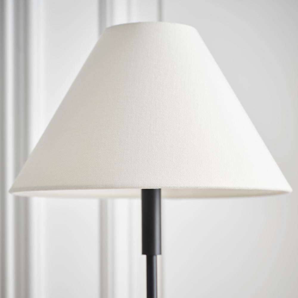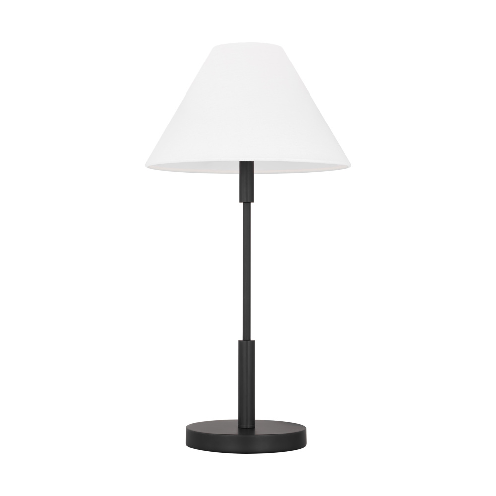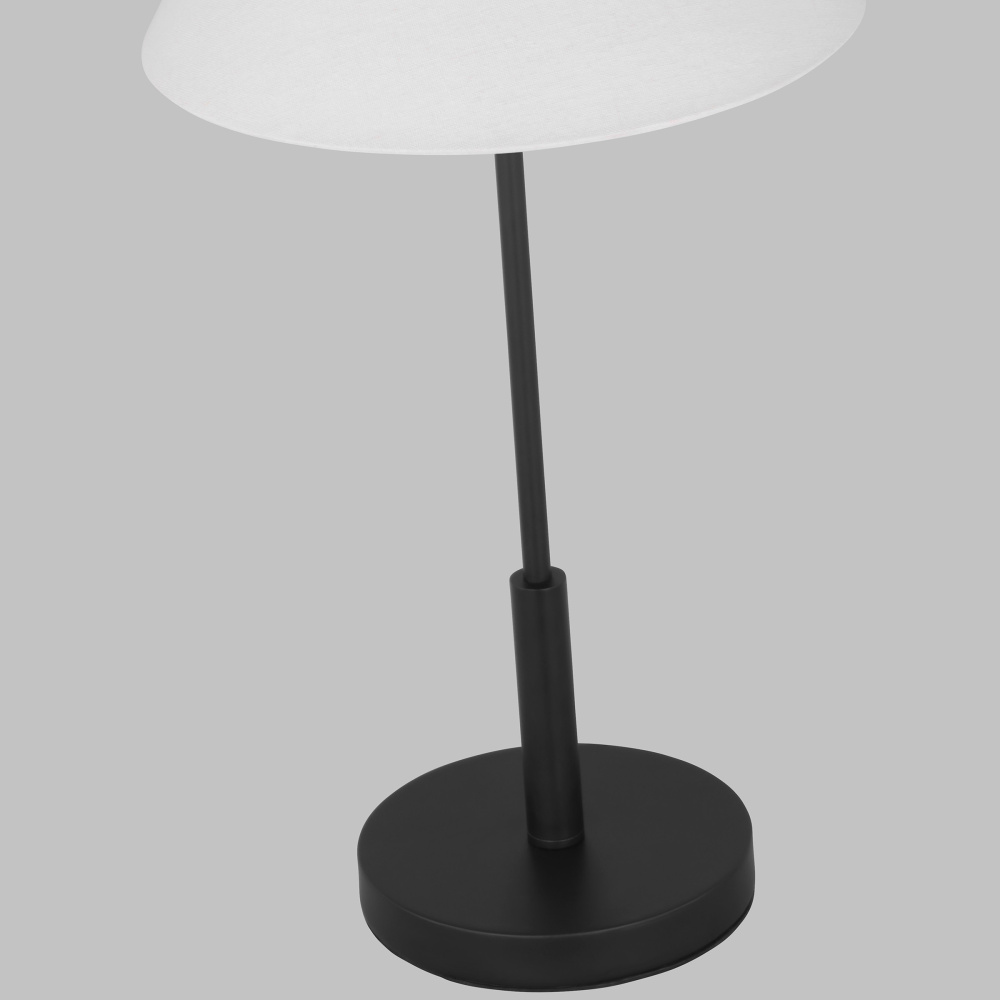 Features a fabric white linen shade and steel base