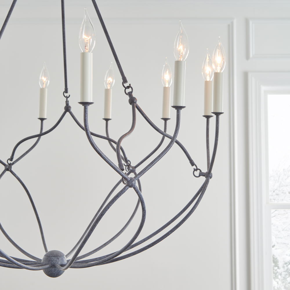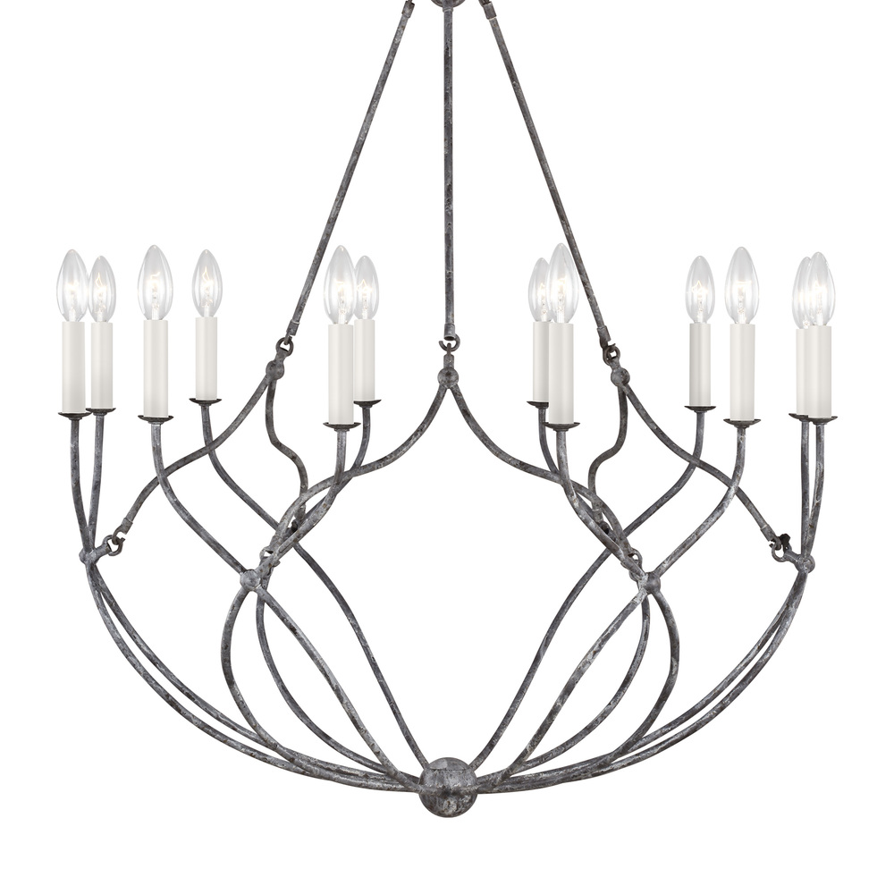 The Richmond twelve light single tier chandelier lends romance and whimsy to any space. A Weathered Galvanized finish forms the twisted fixtures of the eye-catching Richmond series designed by Chapman & Myers for Visual Comfort Studio. This exquisite piece features cream candle tubes and epitomizes the timeless French Country style. Since it is damp-rated, Richmond makes a great statement piece in indoor as well as covered outdoor spaces.