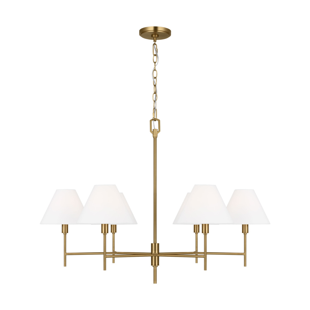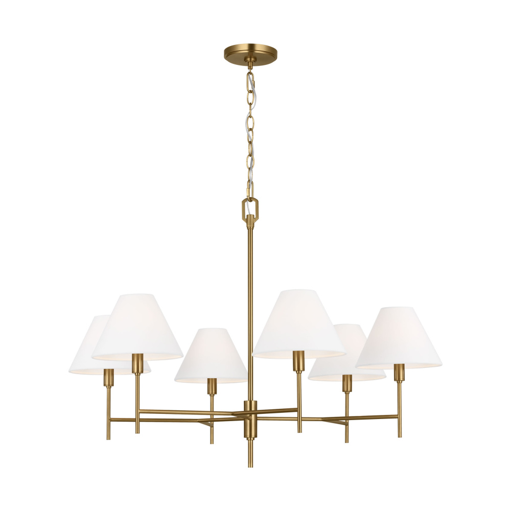 Crafted with Steel in a Burnished Brass finish with white linen fabric shades
