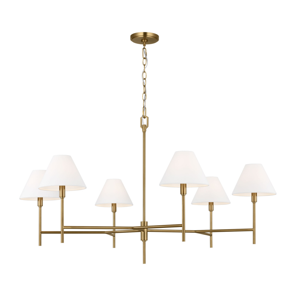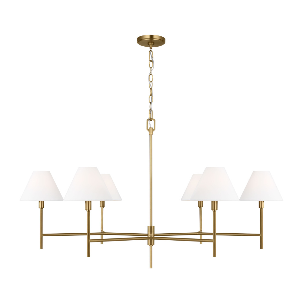 Crafted with Steel in a Burnished Brass finish with white linen fabric shades