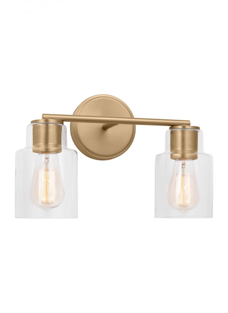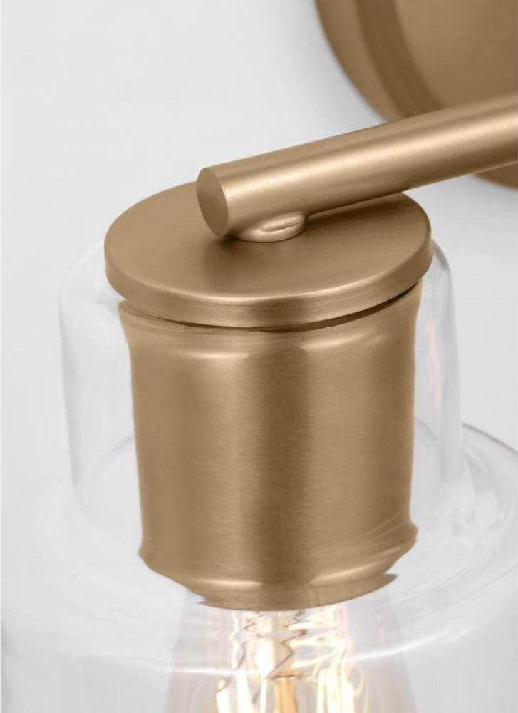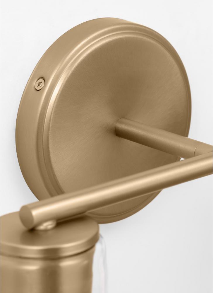Add a bright burst of light where you need it most with the classic Drew & Jonathan Sayward Two Light Wall / Bath Sconce, featuring a round metal backplate and clear glass shades. Made to coordinate across a broader range of bath hardware and design styles, the Sayward is available in four popular finishes, Brushed Steel, Chrome, Midnight Black, and Satin Brass. This light looks great on its own or installed above a bathroom vanity, and the glass shades make it ideal for filament bulbs. This fixture may be mounted in the up or down position, and is cETL listed for damp locations, making it the perfect lighting solution for any space.
