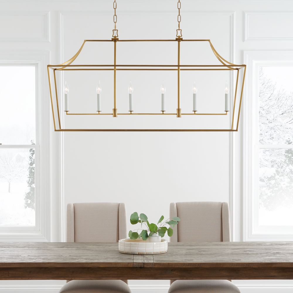Southold by Chapman & Myers pairs curves and lines to form a classic geometric silhouette. This new, contemporary lantern has a thin frame that gives it an airy feel, paired with a tight hub for the candelabra. For a more modern look, try Southold in Polished Nickel. This lantern series will make any space well-lit and elegant.