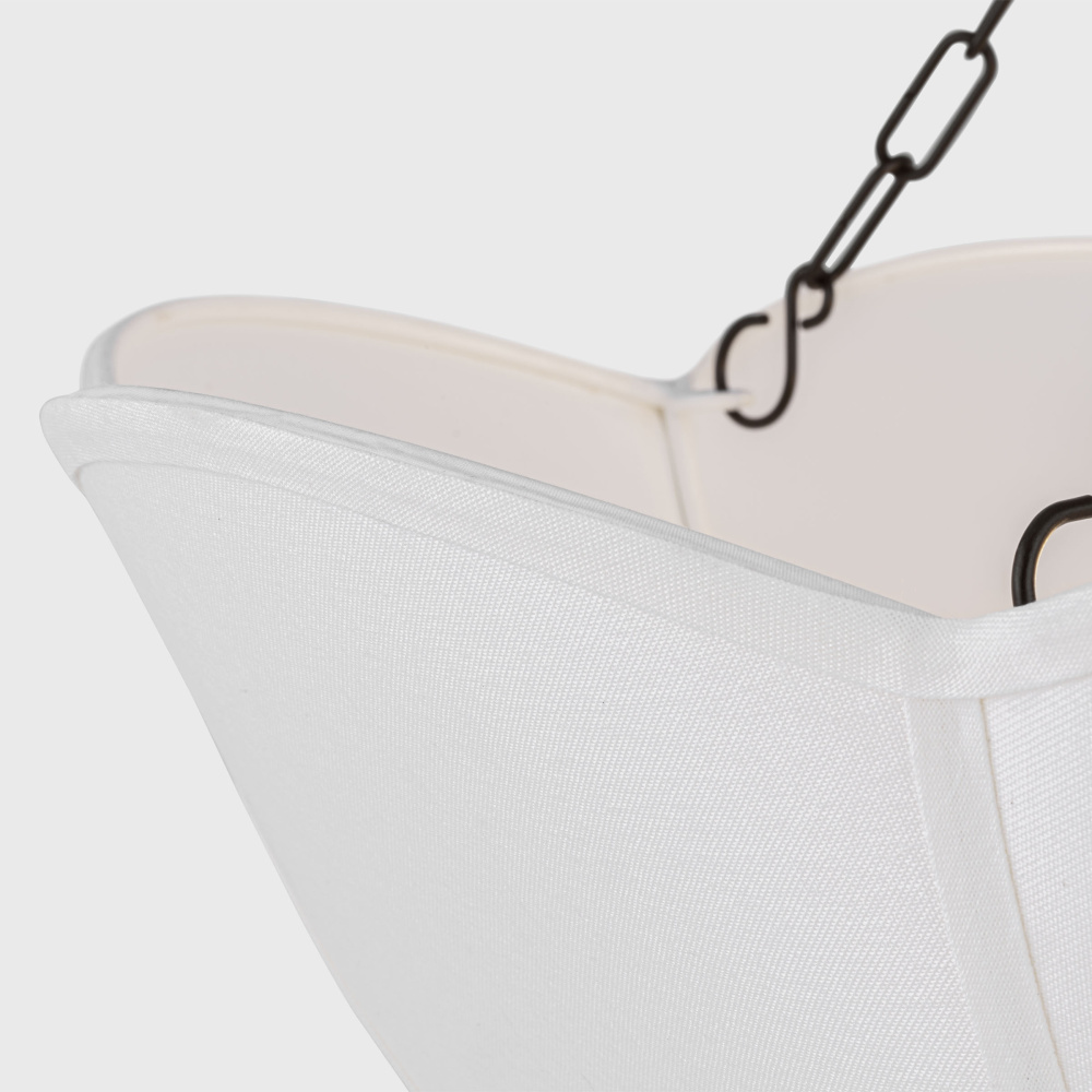 The interplay between the white linen shade and metal chain adds texture and visual interest