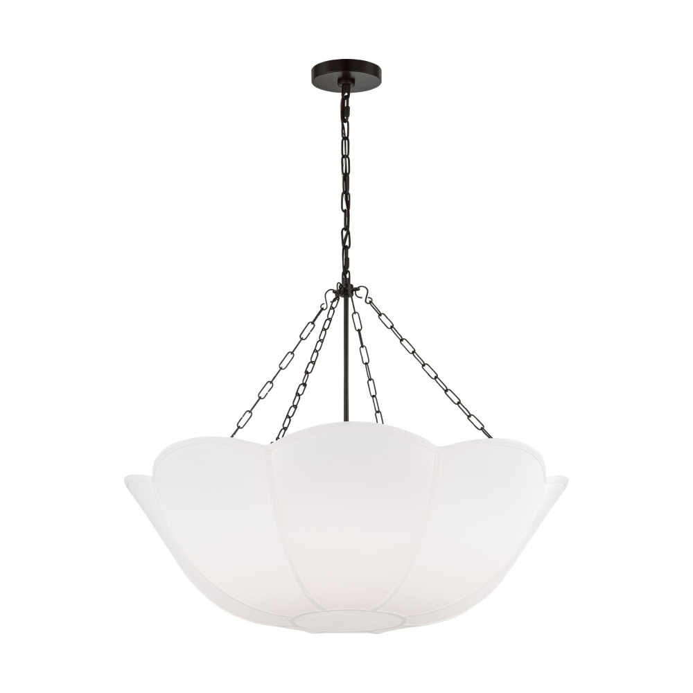 Reminiscent of a spring tulip, the Stassi series by Alexa Hampton updates Art Nouveau inspiration with a modern aesthetic. The scalloped basket silhouette is completed by the contrast of metal chain and white linen. The chandelier will create a harmonious statement hanging in a living room, dining room or bedroom.