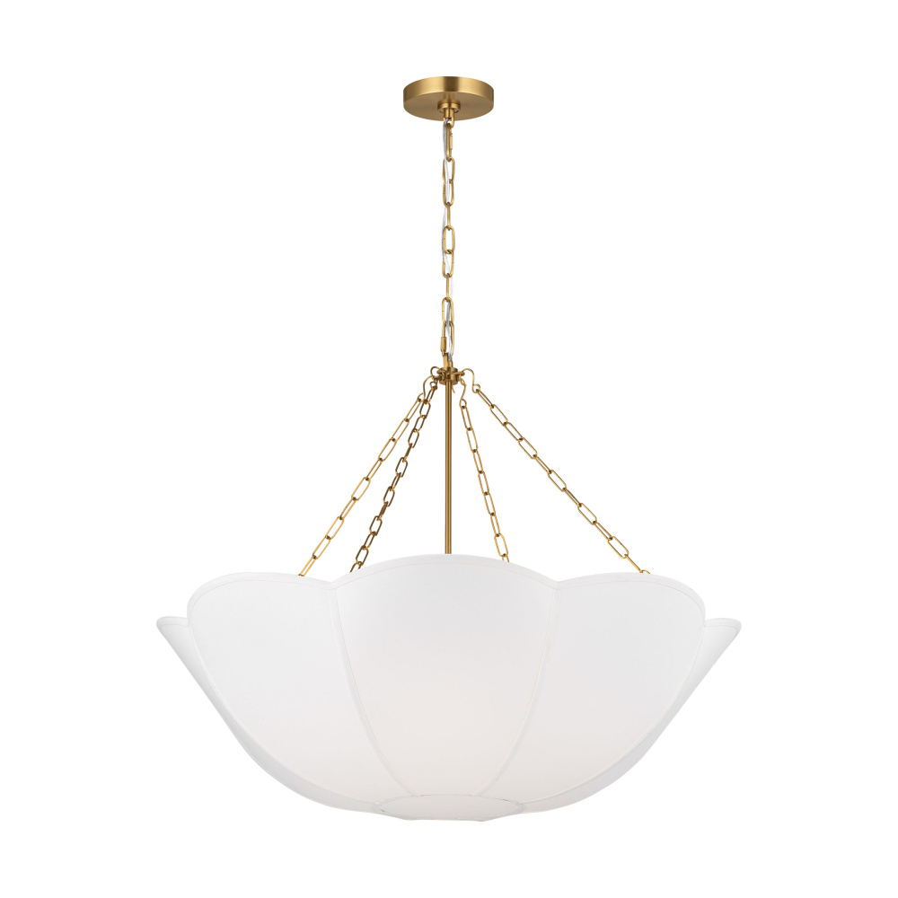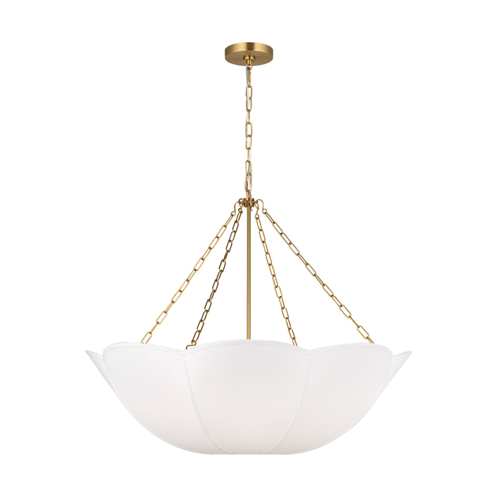 Reminiscent of a spring tulip, the Stassi series by Alexa Hampton updates Art Nouveau inspiration with a modern aesthetic. The scalloped basket silhouette is completed by the contrast of metal chain and white linen. The chandelier will create a harmonious statement hanging in a living room, dining room or bedroom.