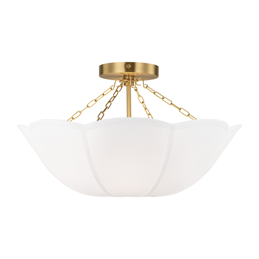 Reminiscent of a spring tulip, the Stassi series by Alexa Hampton updates Art Nouveau inspiration with a modern aesthetic. The scalloped basket silhouette is completed by the contrast of metal chain and white linen. The chandelier will create a harmonious statement hanging in a living room, dining room or bedroom.