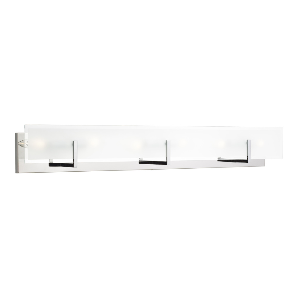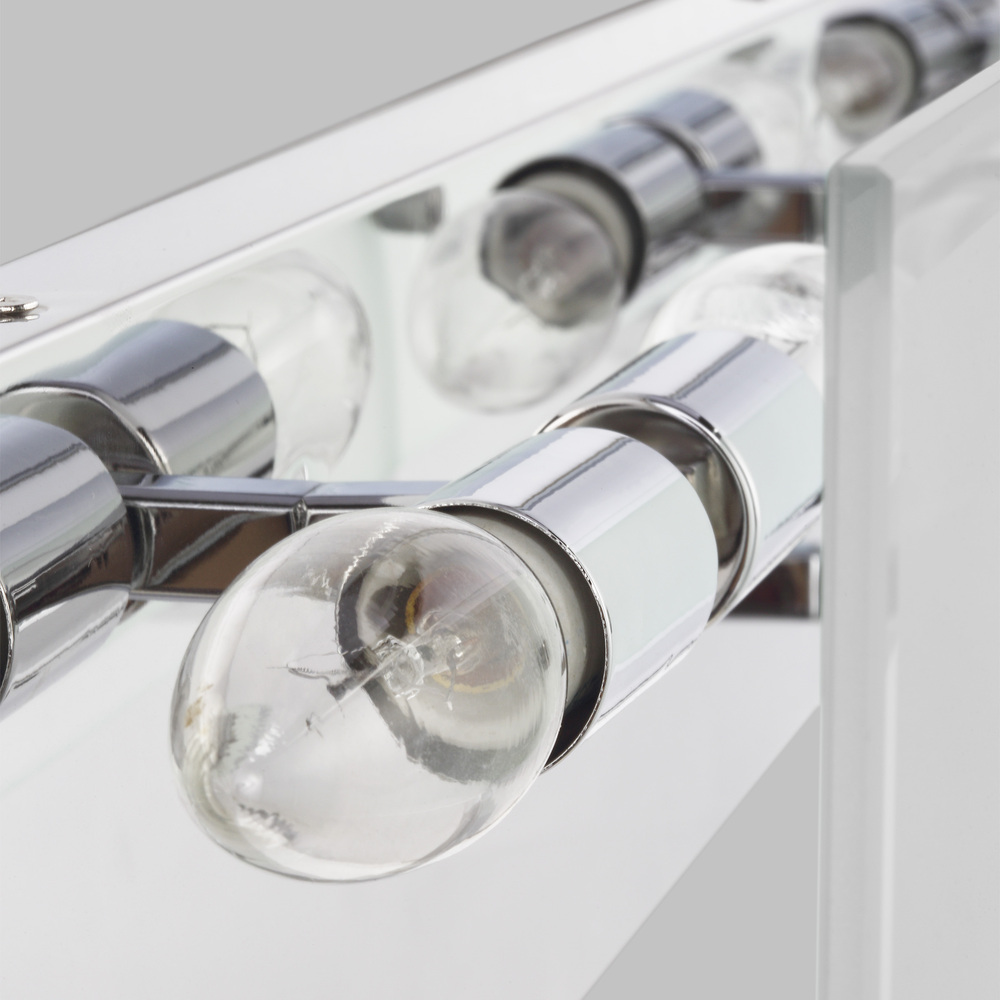 The Syll six light vanity fixture in chrome offers shadow-free lighting in your powder room, spa, or master bath room. Syll features a stylish frame with brilliant frosted beveled glass panels.