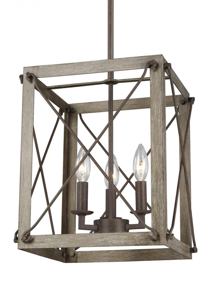 The Thornwood three light indoor pendant in washed pine exudes authenticity, combining the tactile with the time-worn. Perfect proportions and honest functionality complete the package. The Thornwood lighting collection offers three-light, four-light and eight-like chandeliers, an eight-light linear, four-light foyer chandelier, and a two-light wall sconce. The two-light wall sconce is Damp Rated. Available in Washed Pine and a Weathered Iron Finish.