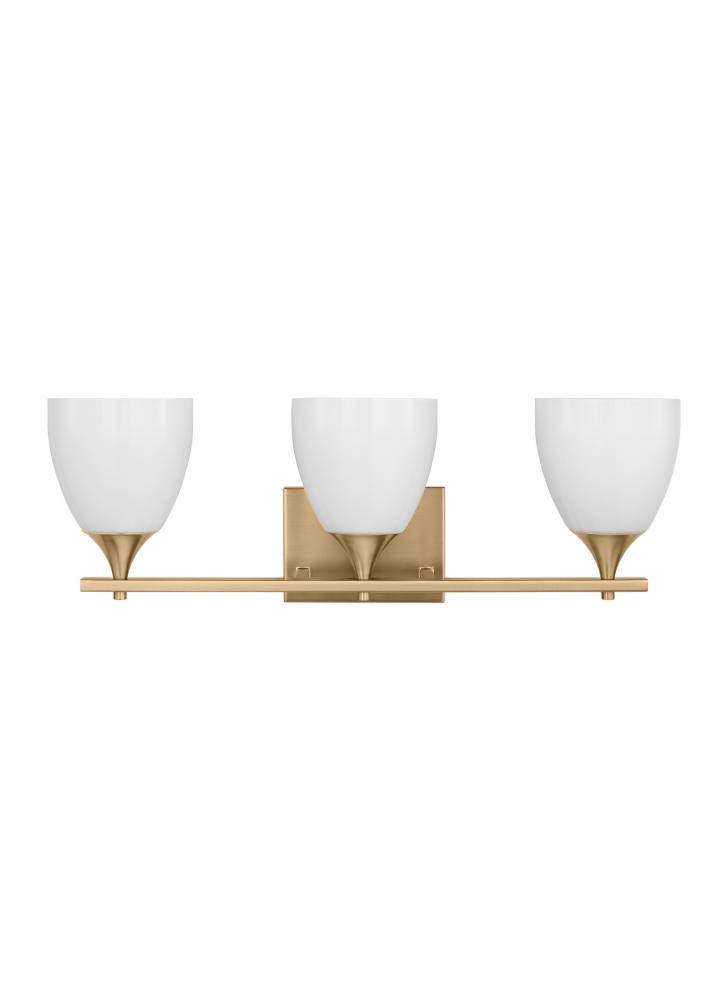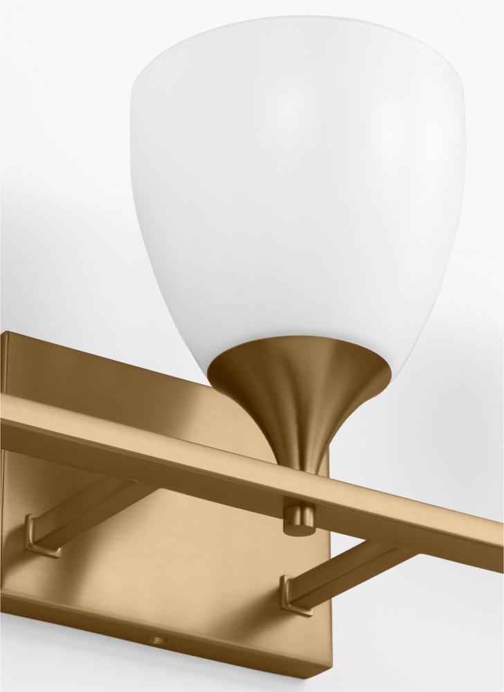 Made to coordinate across a broader range of bath hardware and design styles, this light breathes new life to its traditional shape with milk glass shades and striking, modern finishes