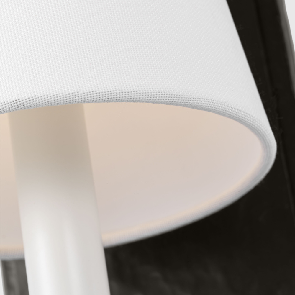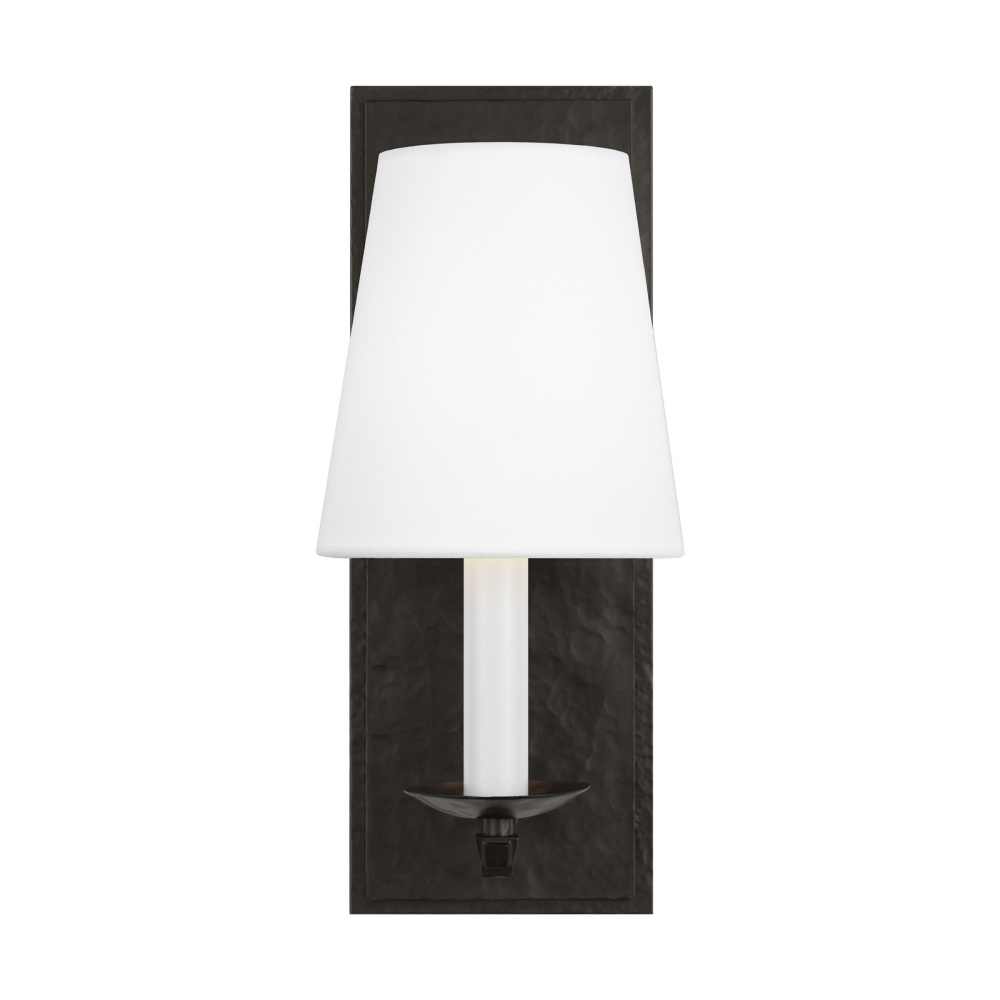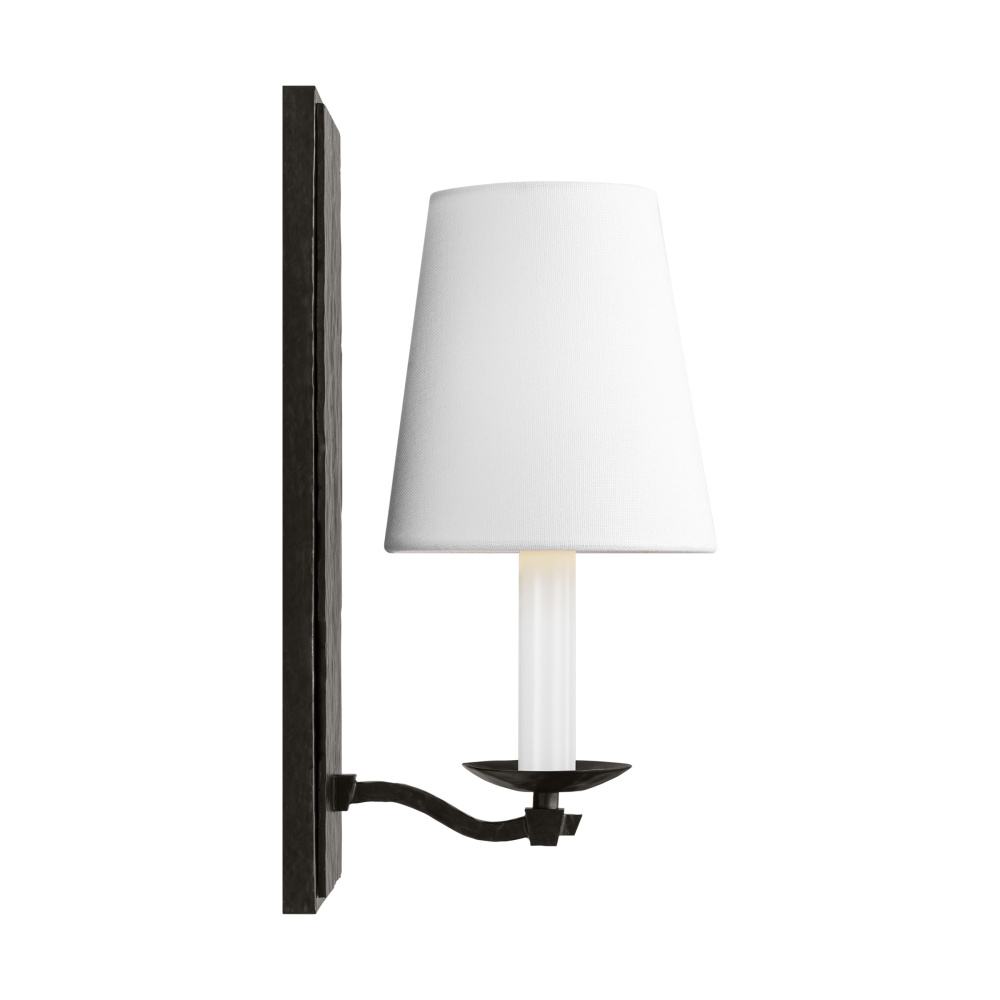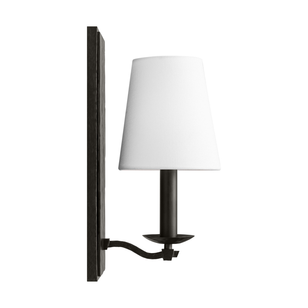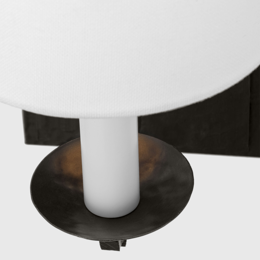 Crafted with Steel in a Aged Iron finish with white linen fabric shade