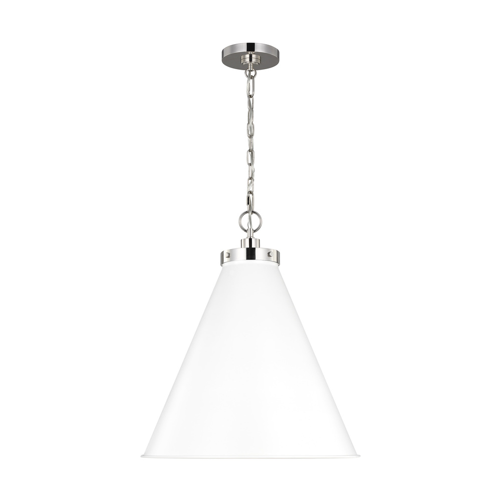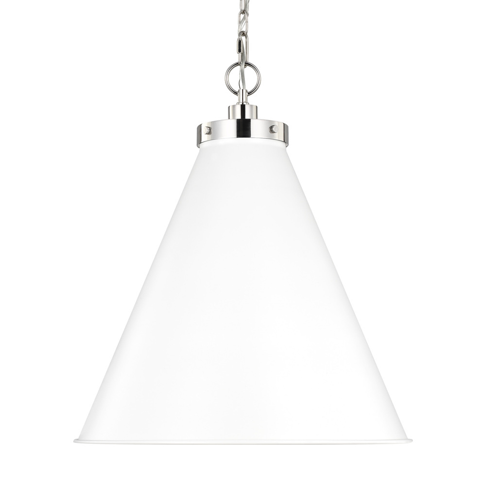 Inspired by various classic utility silhouettes - from factory lighting to barn sconces - capped by contrasting metal hardware. Each shade of the Wellfleet series by Chapman & Myers is available multiple sizes of 3 versatile profiles; either a flat farm dome, a traditional factory dome, or tapered cone. The shades are available with either a black or white finish and are paired with either a burnished brass or polished nickel collar, chain and canopy.