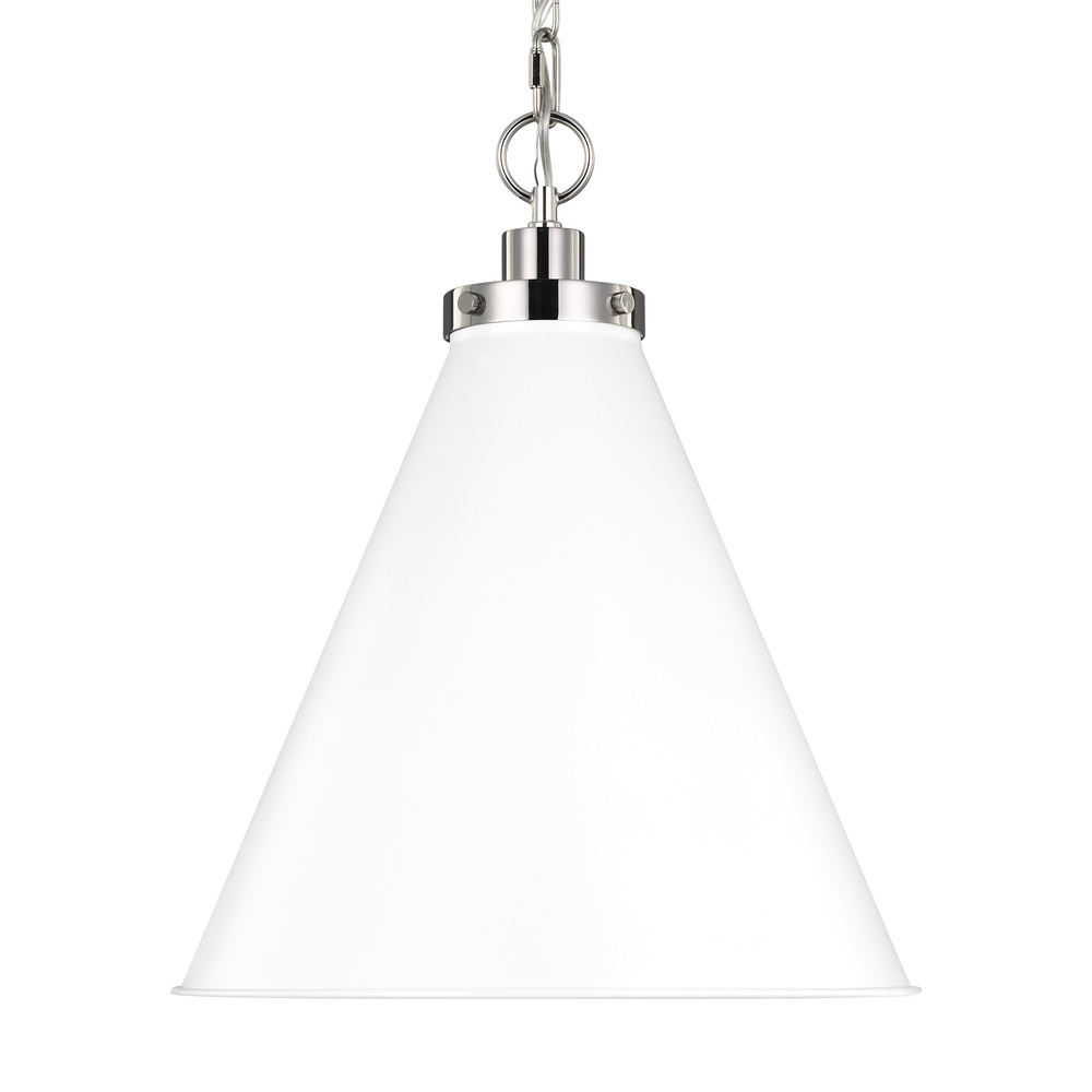 Inspired by various classic utility silhouettes - from factory lighting to barn sconces - capped by contrasting metal hardware. Each shade of the Wellfleet series by Chapman & Myers is available multiple sizes of 3 versatile profiles; either a flat farm dome, a traditional factory dome, or tapered cone. The shades are available with either a black or white finish and are paired with either a burnished brass or polished nickel collar, chain and canopy.