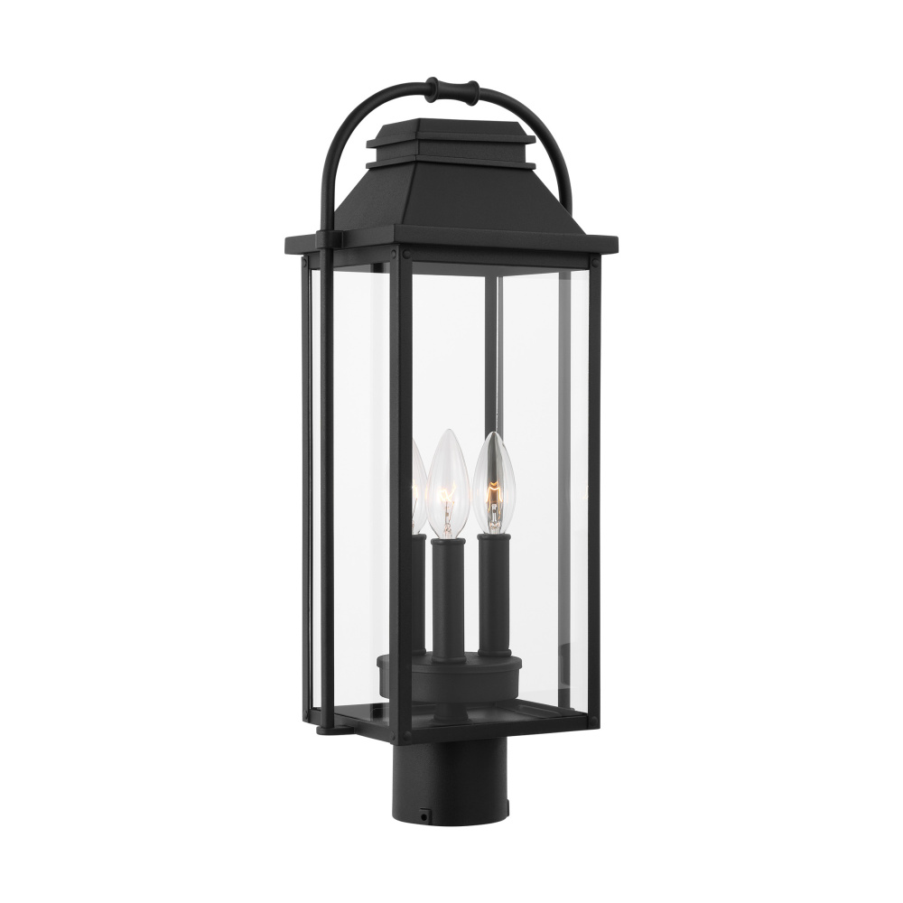 Designed by Sean Lavin, the Wellsworth three-light outdoor post top in textured black creates a warm and inviting welcome presentation for your home's exterior. A subtle interplay of traditional design elements and nautical influences creates the charming visual approach to the Wellsworth outdoor collection by Visual Comfort Studio. Available in three finishes and two different aesthetics. Antique Bronze finish paired with Clear Seeded glass creates a more traditional look to these outdoor light fixtures, while Burnished Brass and Painted Brushed Steel finish and Clear glass reflect a more contemporary approach. The Wellsworth collection includes a 3-light outdoor pendant, a 3-light outdoor post lantern, and 3-light small and medium outdoor lanterns, as well as a 4-light large outdoor lantern. Cast aluminum construction ensures durability. Wet Rated.