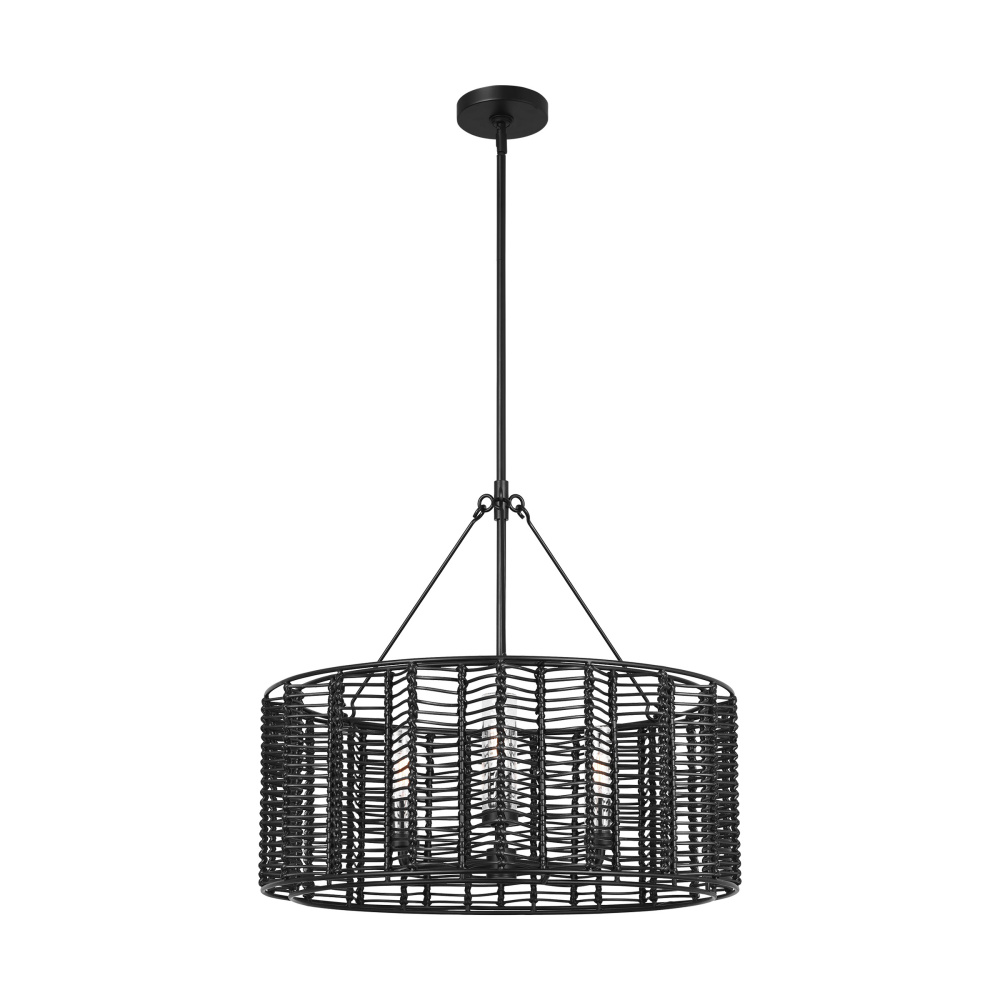The Winslow series by Thom Filicia redefines the timeless chevron motif with a bold, three-dimensional design that brings texture and depth to any space. The intricately woven strands form a striking silhouette that surrounds an interior candelabra, allowing light to filter through and create captivating patterns and shadows. This innovative take on a classic design lends a contemporary edge while maintaining a sense of timeless elegance. Whether hung as a statement piece in a dining room, layered in a cozy living area, or under a covered patio, the Winslow hanging shades are a versatile choice that seamlessly blends with styles .