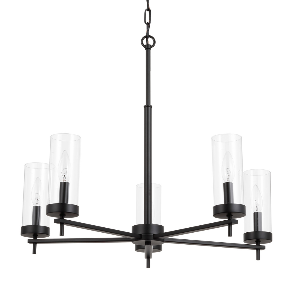 The Zire five light chandelier in Midnight Black finish embodies simple clean lines that strike a perfect balance of elegant yet minimalist design. Each of the lights sits on the round bottom rim, featuring an Edison-inspired design highlighted by a cylindrical glass shade. The assortment includes nine-light, five-light, and three-light chandeliers, a five light linear, one-light large and mini-pendants, and one-light, two-light, three-light and four-light wall/bath fixtures. A stylish and elegant addition to any room in the house. Zire is offered in a Brushed Oil Rubbed Bronze, Brushed Nickel, Chrome, Satin Brass or Midnight Black finishes.