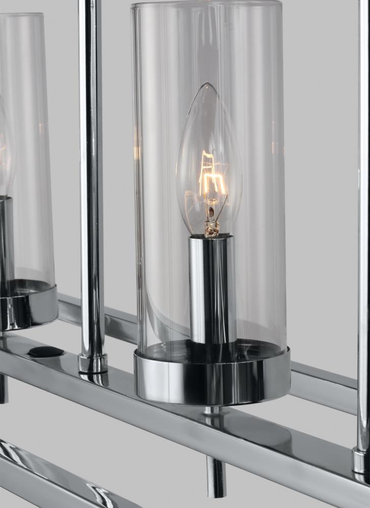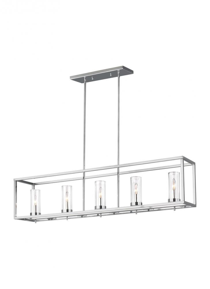 The Zire five light kitchen island light in chrome uses LED bulbs to save you both time and money. Zire embodies simple clean lines in three finishes that strike a perfect balance of elegant yet minimalist design. Each of the lights sits on the round bottom rim, featuring an Edison-inspired design highlighted by a cylindrical glass shade. The assortment includes nine-light, five-light, and three-light chandeliers, a five light linear, one-light mini-pendant and one-light, two-light, three-light and four-light wall/bath fixtures. A stylish and elegant addition to any room in the house. Zire is offered in a Brushed Oil Rubbed Bronze, Brushed Nickel, Chrome, Satin Brass or Midnight Black finish.