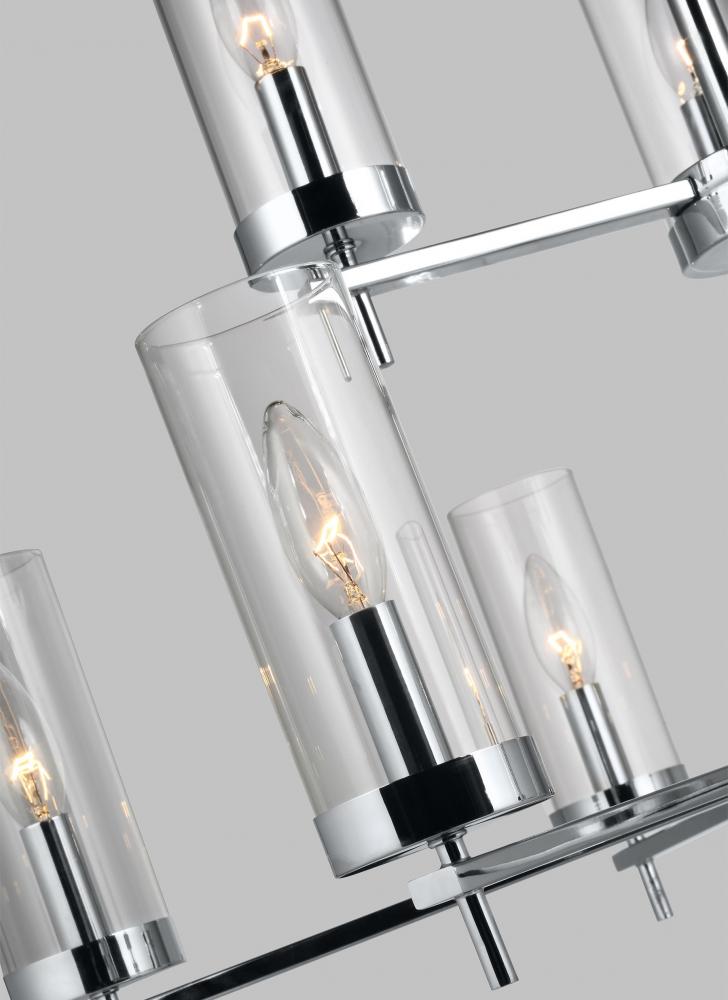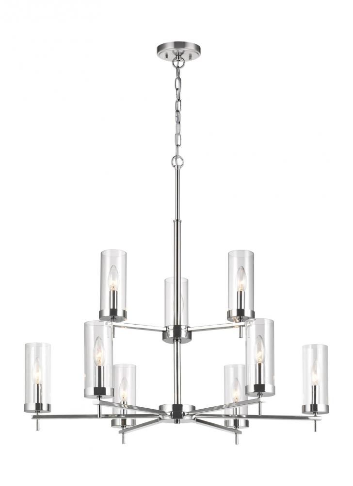 The Zire nine light multi-tier chandelier in chrome uses LED bulbs to save you both time and money. Zire embodies simple clean lines in three finishes that strike a perfect balance of elegant yet minimalist design. Each of the lights sits on the round bottom rim, featuring an Edison-inspired design highlighted by a cylindrical glass shade. The assortment includes nine-light, five-light, and three-light chandeliers, a five light linear, one-light mini-pendant and one-light, two-light, three-light and four-light wall/bath fixtures. A stylish and elegant addition to any room in the house. Zire is offered in a Brushed Oil Rubbed Bronze, Brushed Nickel or Chrome finish.