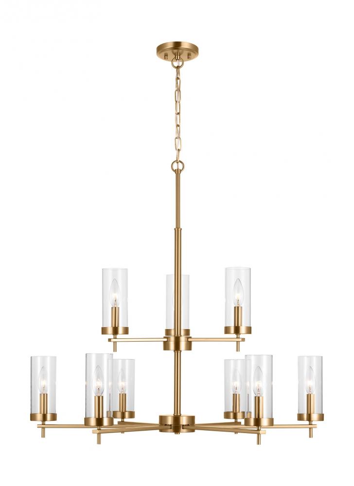 The Zire nine light multi tier chandelier in Satin Brass finish embodies simple clean lines that strike a perfect balance of elegant yet minimalist design. Each of the lights sits on the round bottom rim, featuring an Edison-inspired design highlighted by a cylindrical glass shade. The assortment includes nine-light, five-light, and three-light chandeliers, a five light linear, one-light large and mini-pendants, and one-light, two-light, three-light and four-light wall/bath fixtures. A stylish and elegant addition to any room in the house. Zire is offered in a Brushed Oil Rubbed Bronze, Brushed Nickel, Chrome, Satin Brass or Midnight Black finishes.