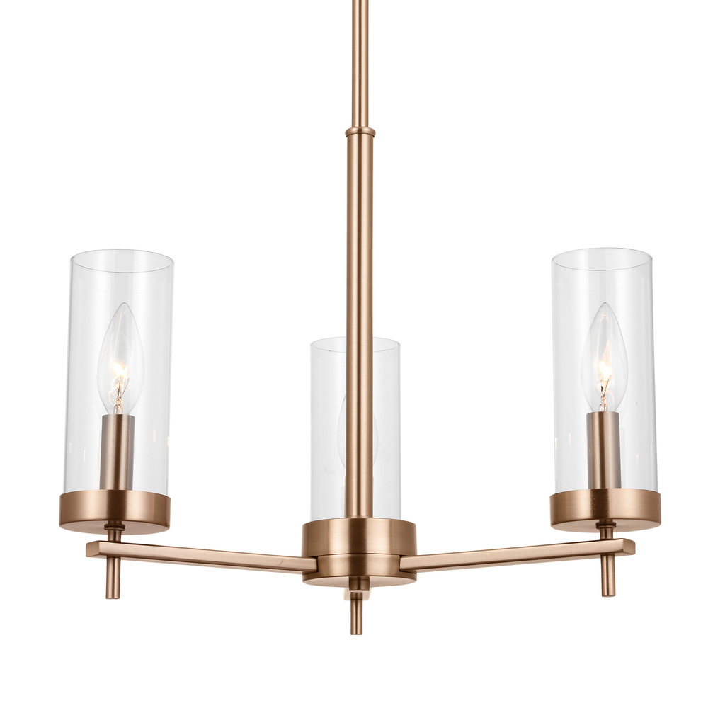 The Zire three light chandelier in Satin Brass finish embodies simple clean lines that strike a perfect balance of elegant yet minimalist design. Each of the lights sits on the round bottom rim, featuring an Edison-inspired design highlighted by a cylindrical glass shade. The assortment includes nine-light, five-light, and three-light chandeliers, a five light linear, one-light large and mini-pendants, and one-light, two-light, three-light and four-light wall/bath fixtures. A stylish and elegant addition to any room in the house. Zire is offered in a Brushed Oil Rubbed Bronze, Brushed Nickel, Chrome, Satin Brass or Midnight Black finishes.