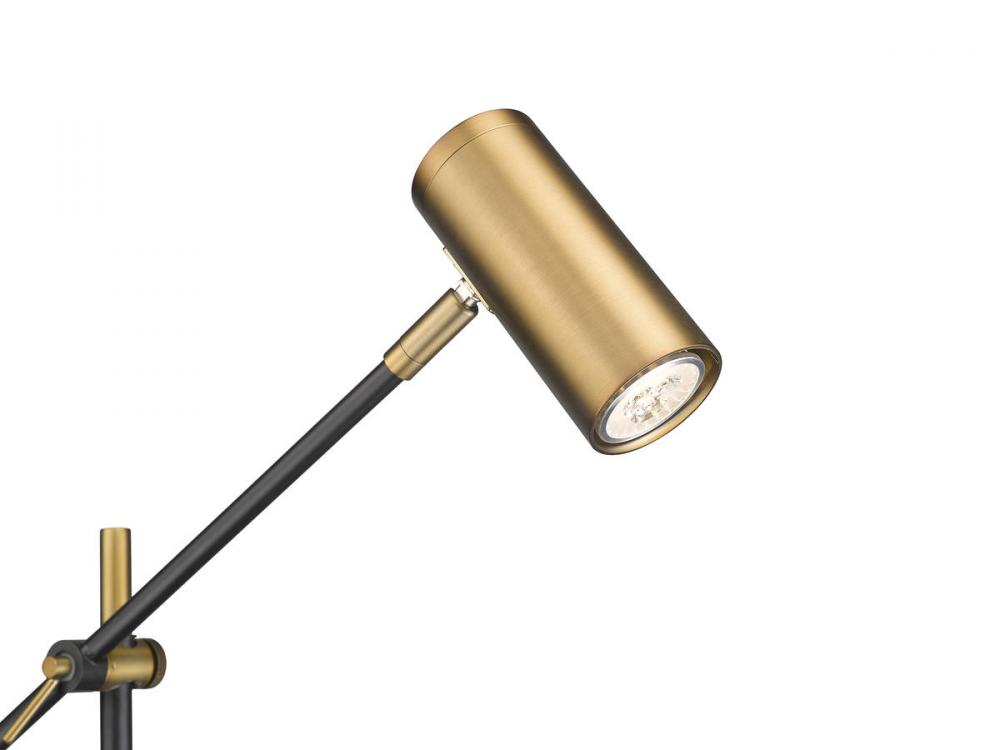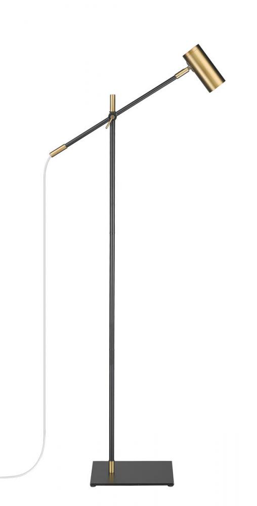This contemporary floor lamp with a cylindrical shade will brighten up your home office or living room. Serving as the ultimate task light, this fixture is constructed of steel in a matte black finish and olde brass accents for a sleek and simplistic appeal.