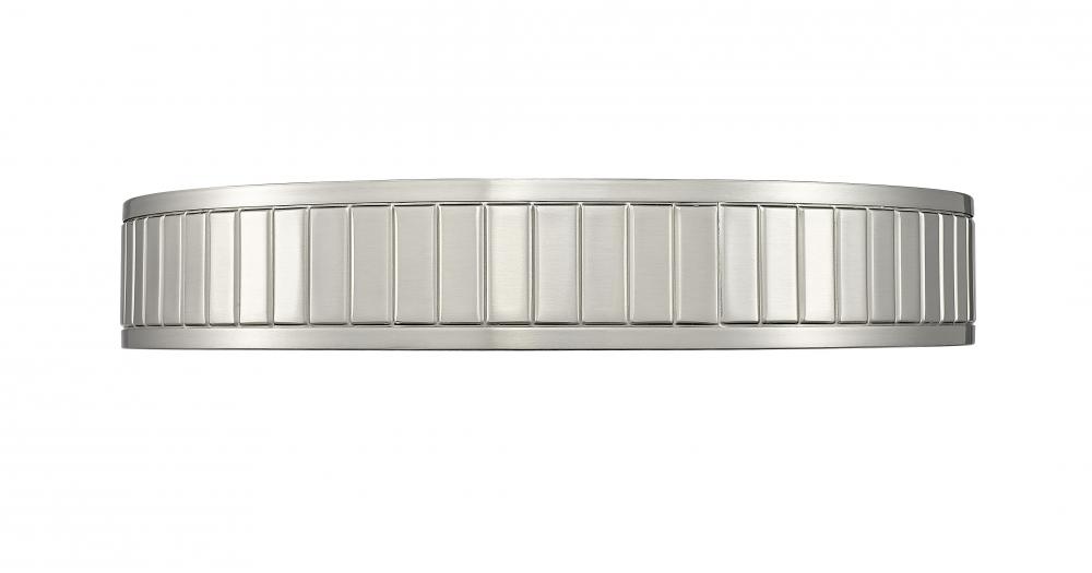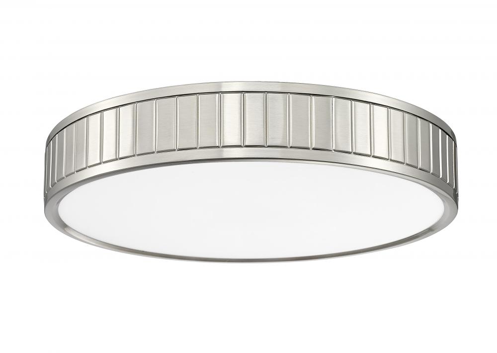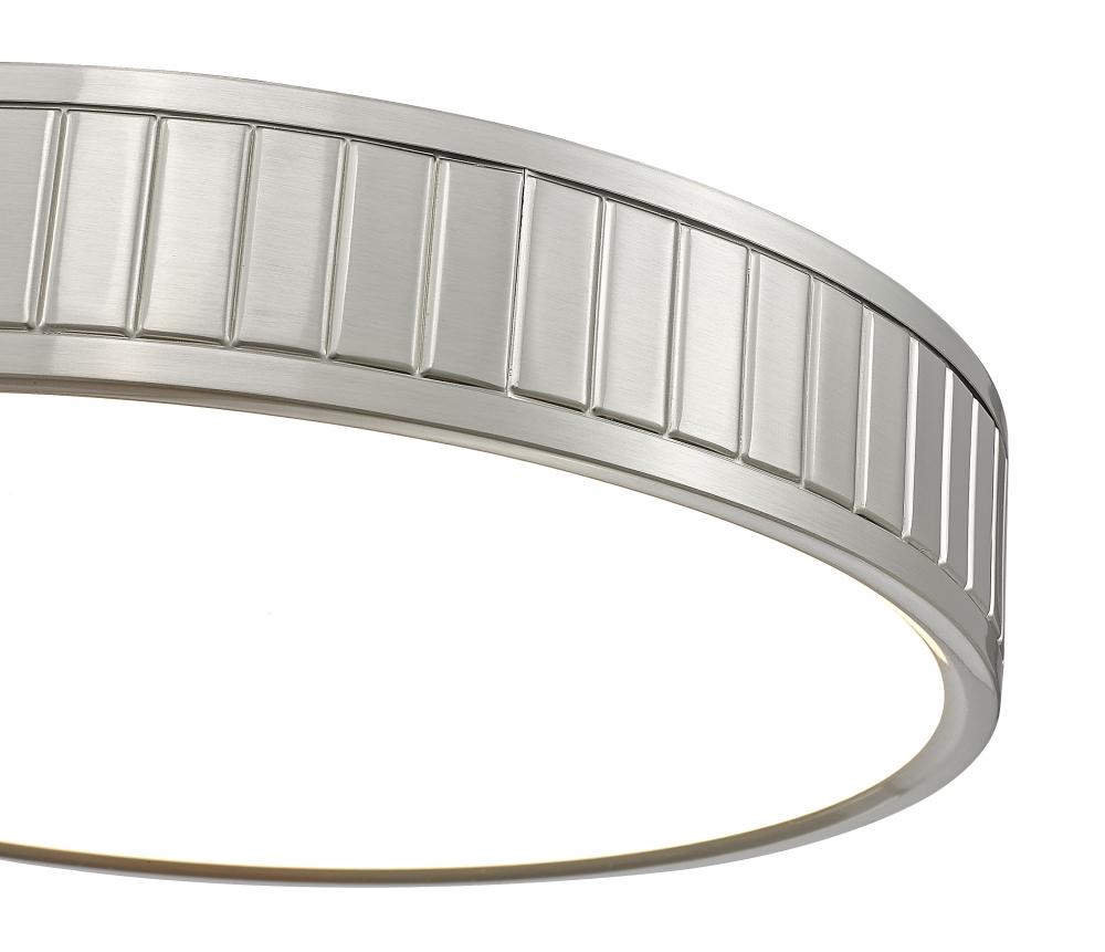 Illumination glowing from above adds stealth yet stylish aesthetics in this one-light flush mount ceiling light. Steel construction forms a ring canopy with a brushed nickel finish and vertical slats nestling a frosted acrylic diffuser that infusing optional and changeable white-color values to light up a modern kitchen, dining room, or foyer.