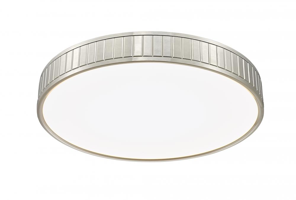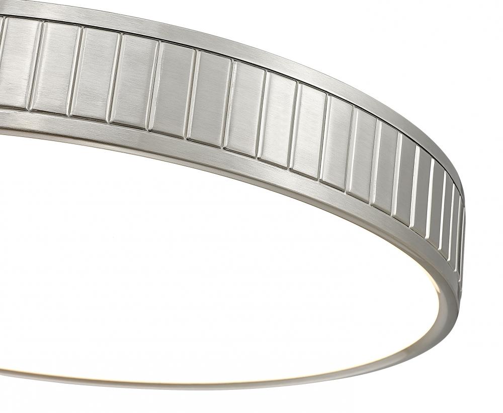 Choose a modern light fixture with versatile design inspiration and textural elegance. This one-light flush mount ceiling light features a brushed nickel finish steel ring canopy with vertical slats nestling a frosted acrylic diffuser sends optional and changeable white-color values to light up a modern kitchen, dining room, or foyer.