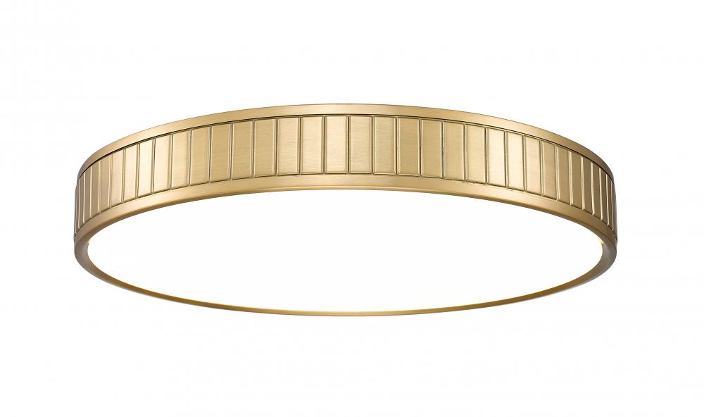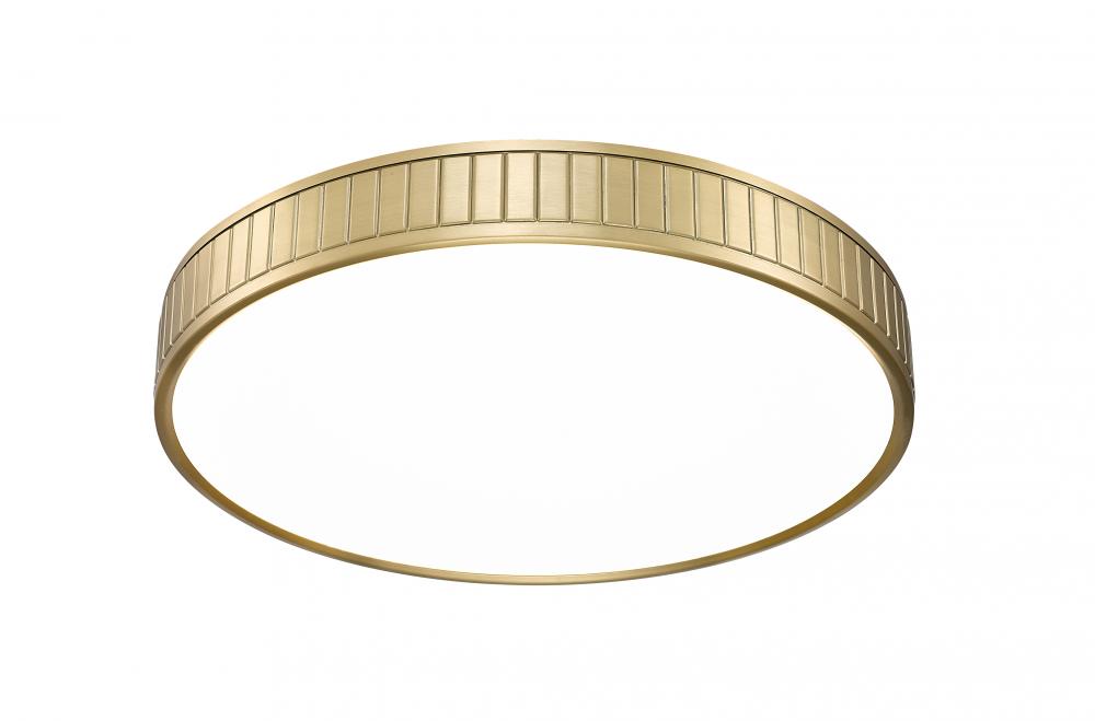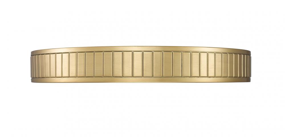 A modern one-light flush mount ceiling light with a versatile design motif creates a stir with a modern gold finish steel ring canopy. Vertical slats offer textural effects in a bezel-like canopy nestling a frosted acrylic diffuser, sending optional and changeable white-color values to light up a modern kitchen, dining room, or foyer.