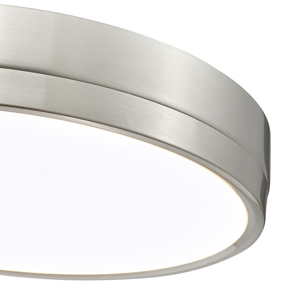 Classic with a touch of retro inspiration, the design of this one-light flush mount ceiling light is versatile for placement in kitchens, entryways, and living spaces. A sleek brushed nickel finish steel canopy nestles a frosted acrylic diffuser filtering dimmable LEDs that offer options for white color levels create a total package.