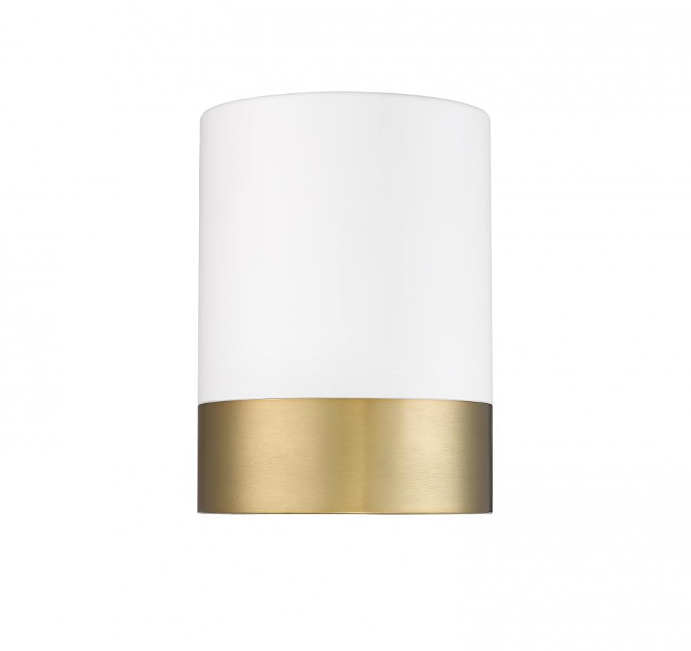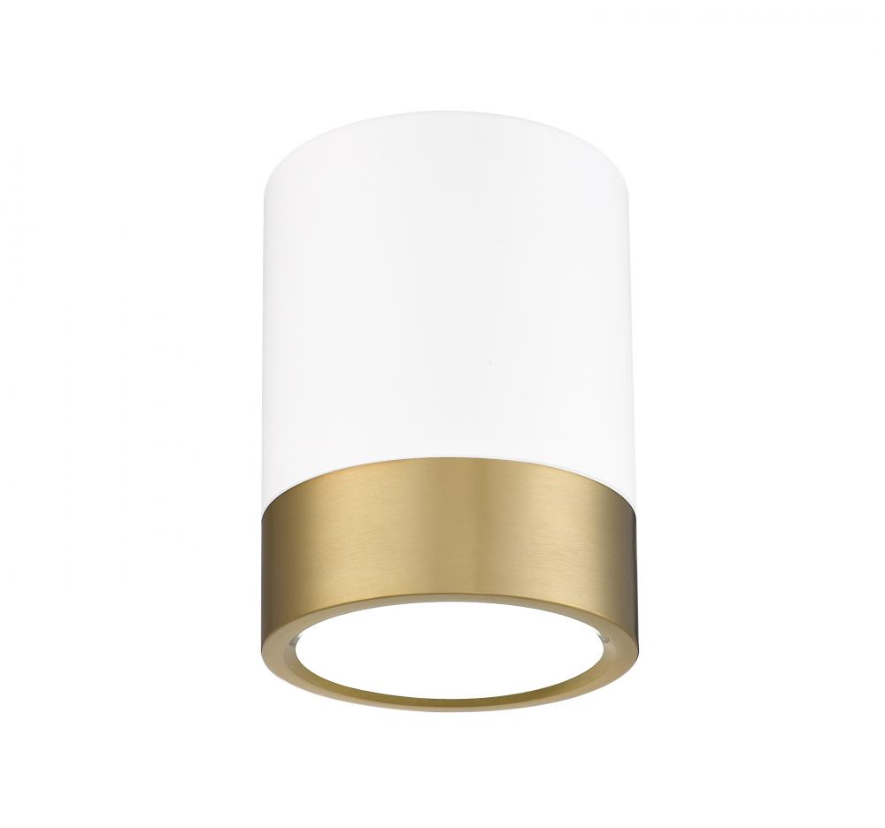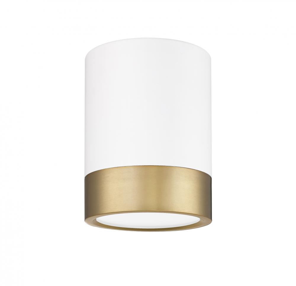 A dual finish palette blends matte white and modern gold steel in a cylindrical shape as this classic one-light flush mount ceiling light complements a kitchen, hallway, or living area. Enjoy dimmable illumination with options for customizable white color values.