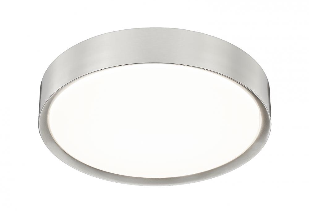 Sleek brushed nickel creates a fresh, refined look for this modern one-light flush mount ceiling light. Integrated LEDs are energy efficient, delivering diffused lighting through a frosted acrylic diffuser that complements a streamlined round silhouette to perfection.