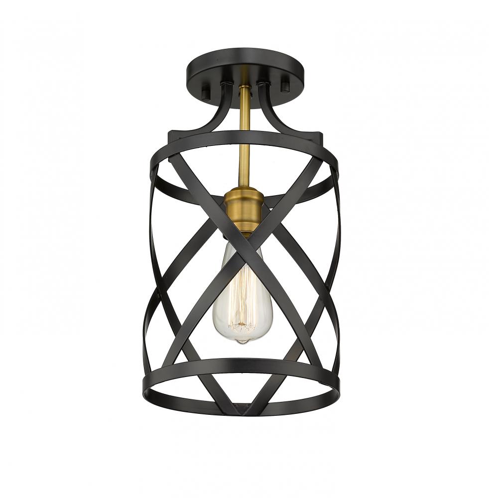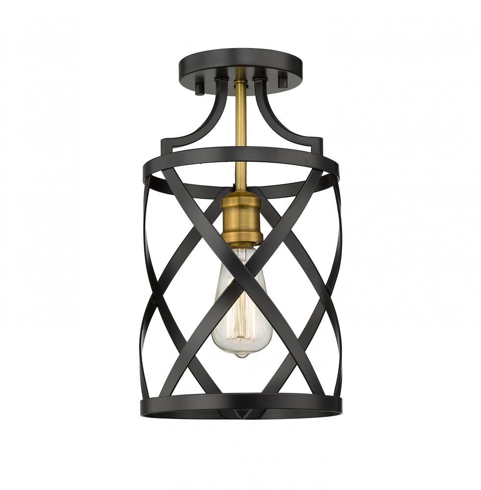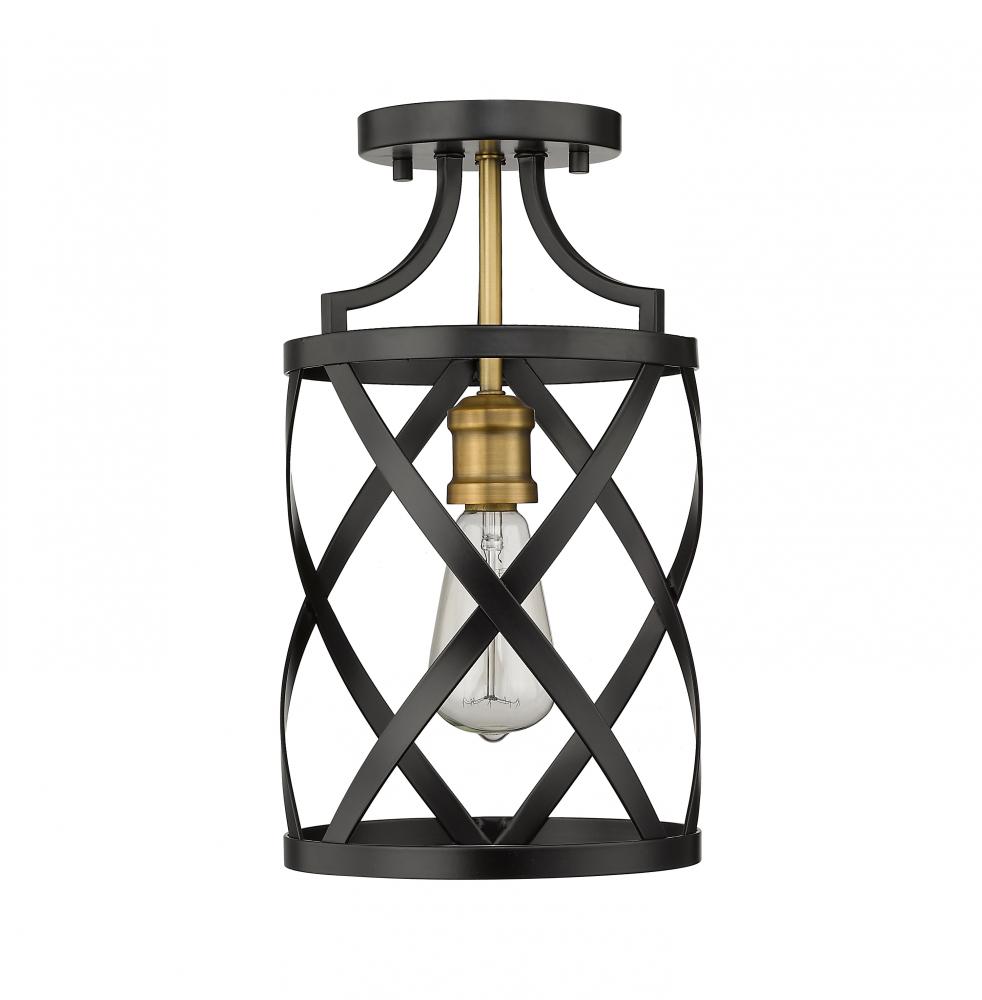 The stylish design of this two-tone one-light flush mount light will dazzle your senses. It features a matte black and olde brass finish in a crisp round design highlighted by a series of overlapping X-cross patterns. This light brings a dynamic element to any hallway, foyer, dining room, or living room.