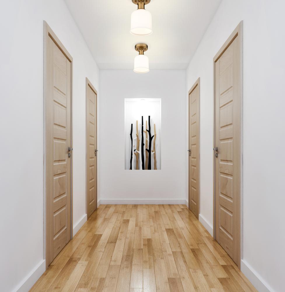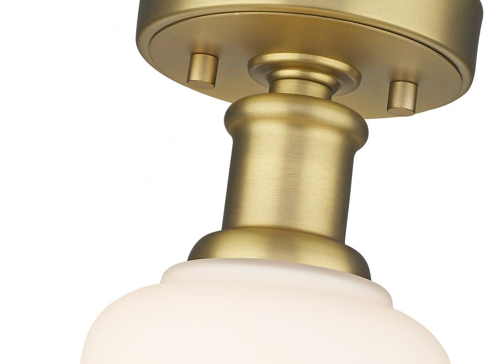 Add a touch of lighting or accent a tight space with this beautifully understated transitional flush mount, designed with a spectacular heritage brass finish plate and versatile gooseneck arm that invites you to rotate and hone in the interior as you wish. With industrial influences and elegant materials, this sophisticated single-light flush lends a sleek, refined expression to modern farmhouse homes with its versatility as well as its soothing glow, presented by a matte opal glass globe. Place this classically designed restoration style flush mount within an entryway foyer or down a hallway, elevating it into a more inviting space.