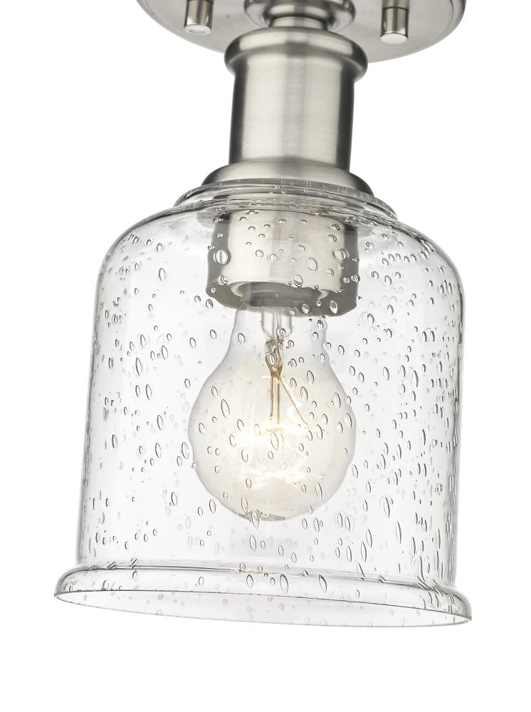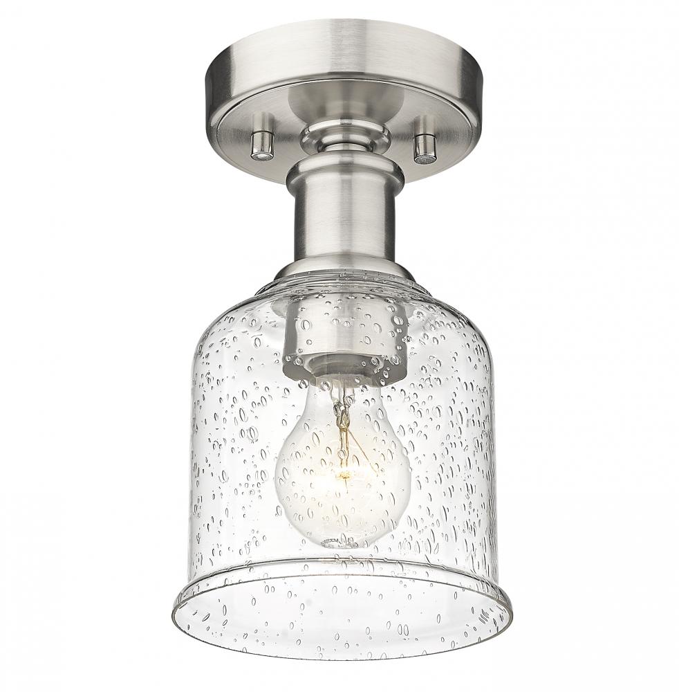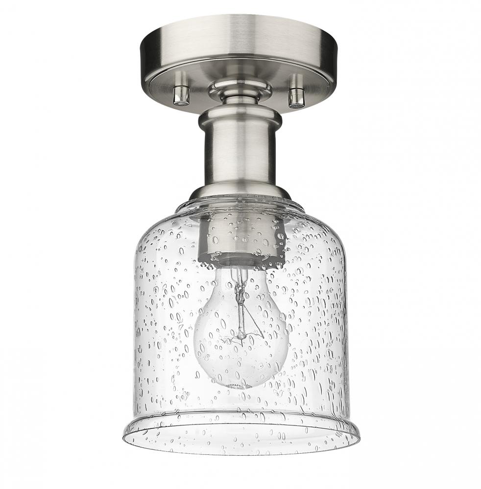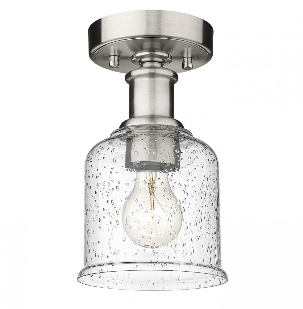 Add a touch of lighting or accent a tight space with this beautifully understated transitional flush mount, designed with shiny brushed nickel finish plate and versatile gooseneck arm that invites you to rotate and hone in on the interior as you wish. With industrial influences and elegant materials, this sophisticated single-light flush lends a sleek, refined expression to modern farmhouse homes with its versatility as well as its soothing glow, presented by a clear seedy glass globe that offers a hint of texture and artisan quality. Place this classically designed restoration style flush mount within an entryway foyer or down a hallway, elevating it into a more inviting space.