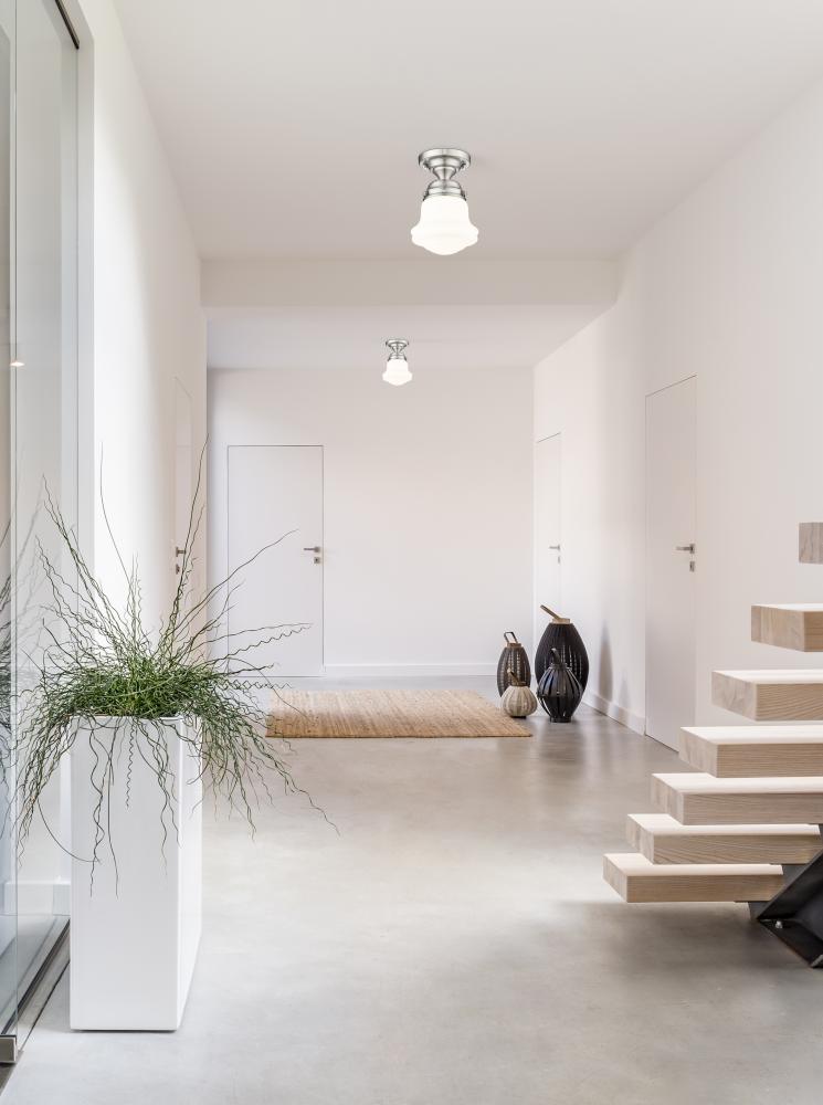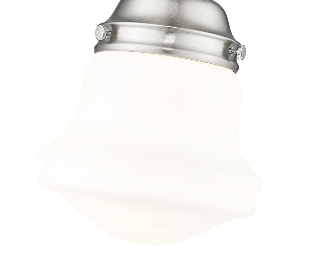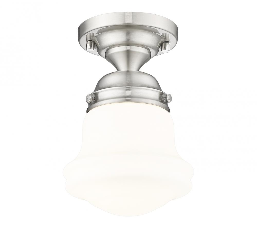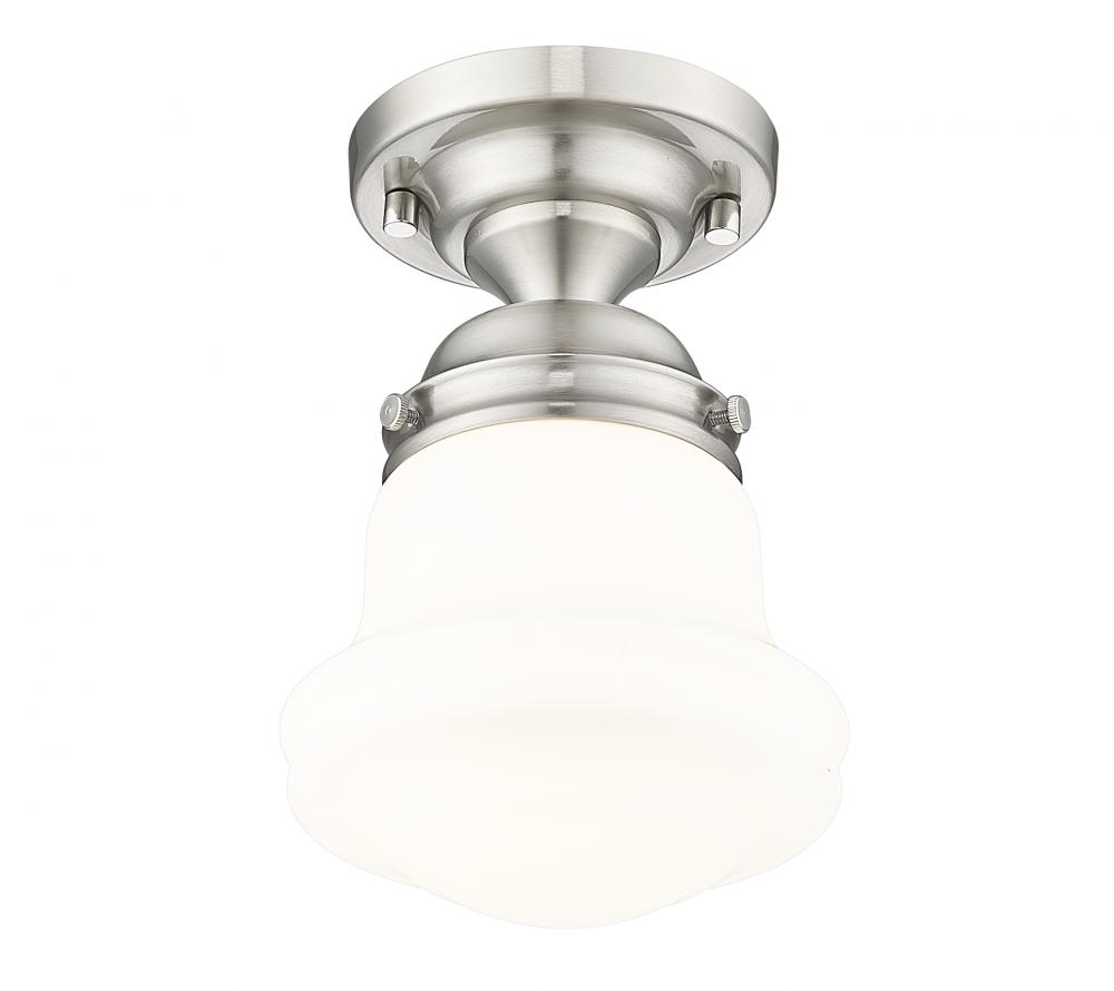 Infused with character, a modern one-light flush mount ceiling light is the perfect upgrade for your bedroom, den or hallway. Its matte opal schoolhouse glass brings exquisite vintage character, while a brushed nickel finish ensures a contemporary ambiance that suits modern living. This close-to-the-ceiling fixture is ideal for rooms with lower ceilings in need of bright, diffused illumining.