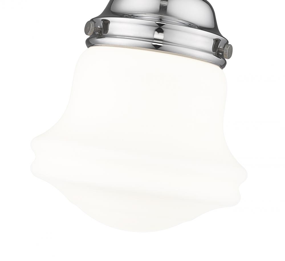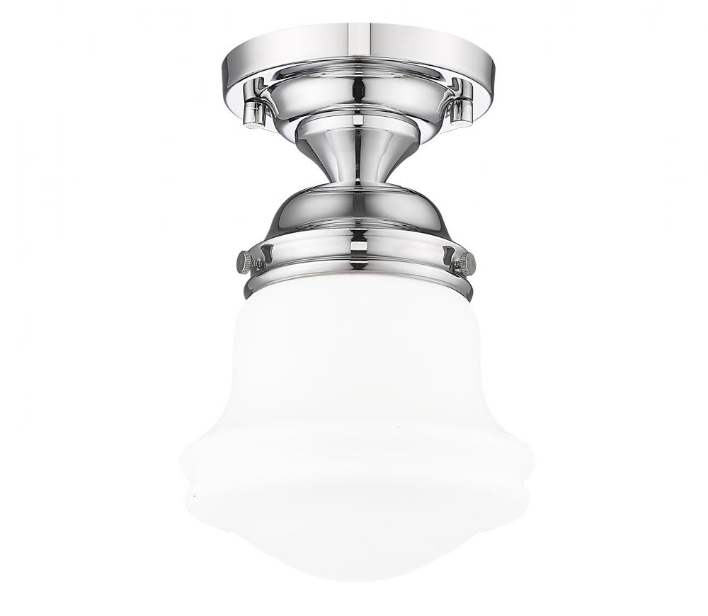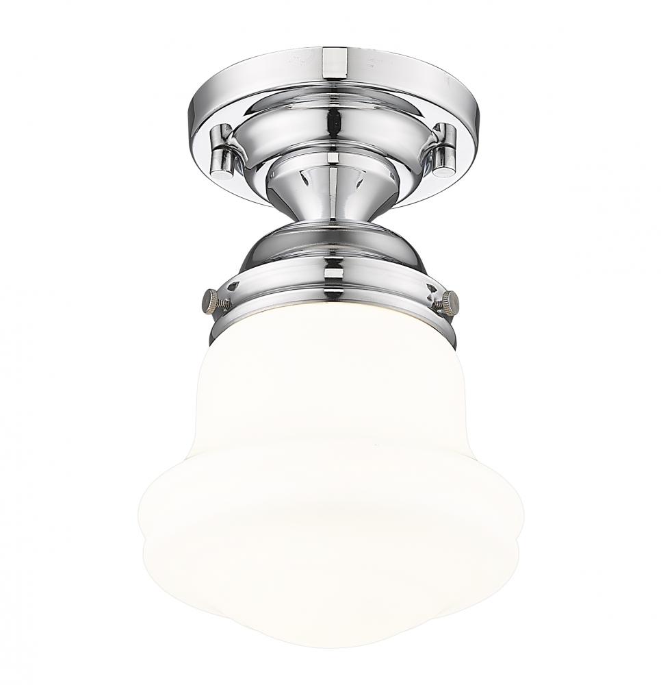 Infused with character, a modern one-light flush mount ceiling light is the perfect upgrade for your bedroom, den or hallway. Its matte opal schoolhouse glass brings exquisite vintage character, while a chrome finish ensures a contemporary ambiance that suits modern living. This close-to-the-ceiling fixture is ideal for rooms with lower ceilings in need of bright, diffused illumining.