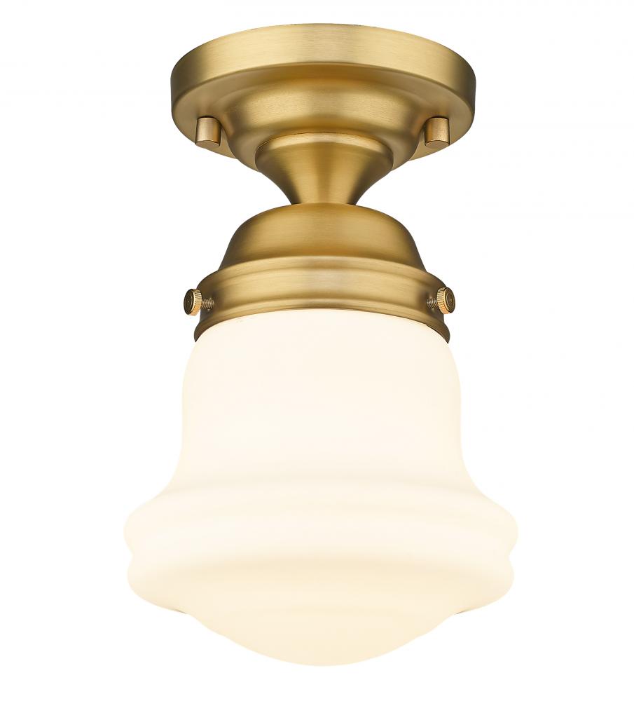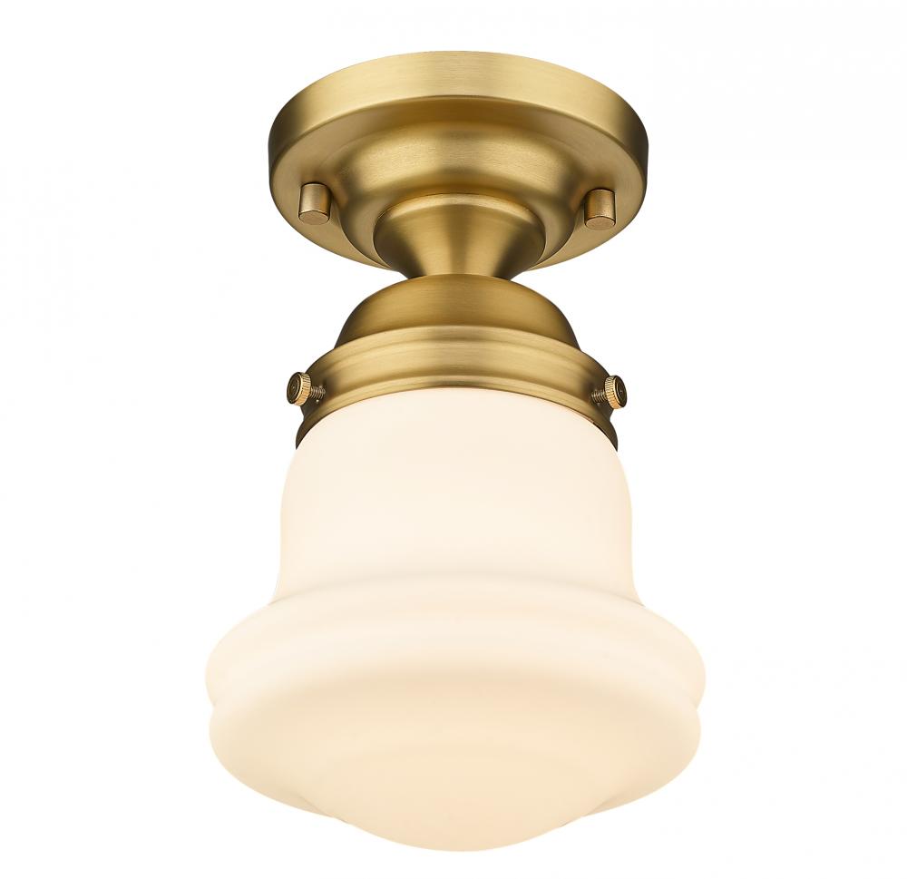 Elevate sophisticated classical interiors with the refined contoured silhouette and smooth surfaces of this petite restoration style flush mount. A small but powerful glow emits from the matte opal glass bell shade tucked within a heritage brass steel mount detailed with rivet accents that lend an industrial schoolhouse-inspired aesthetic and vintage flair. This classical single light flush mount offers a serene ambiance, illuminating foyers, hallways and compact spaces, as it offers a warm metallic touch.