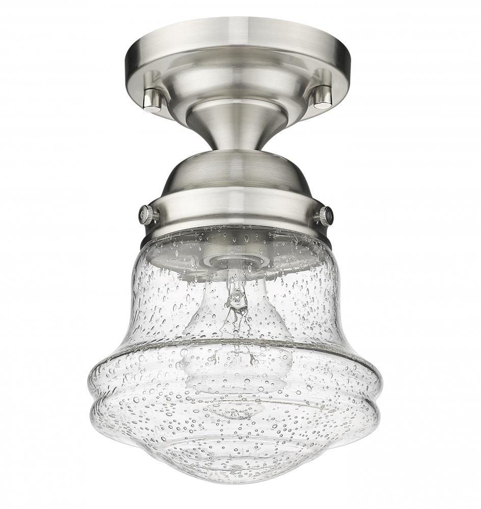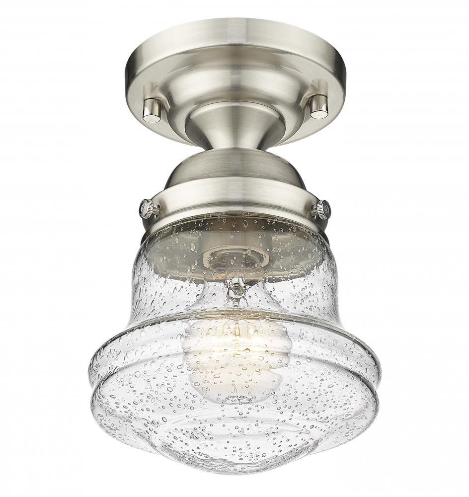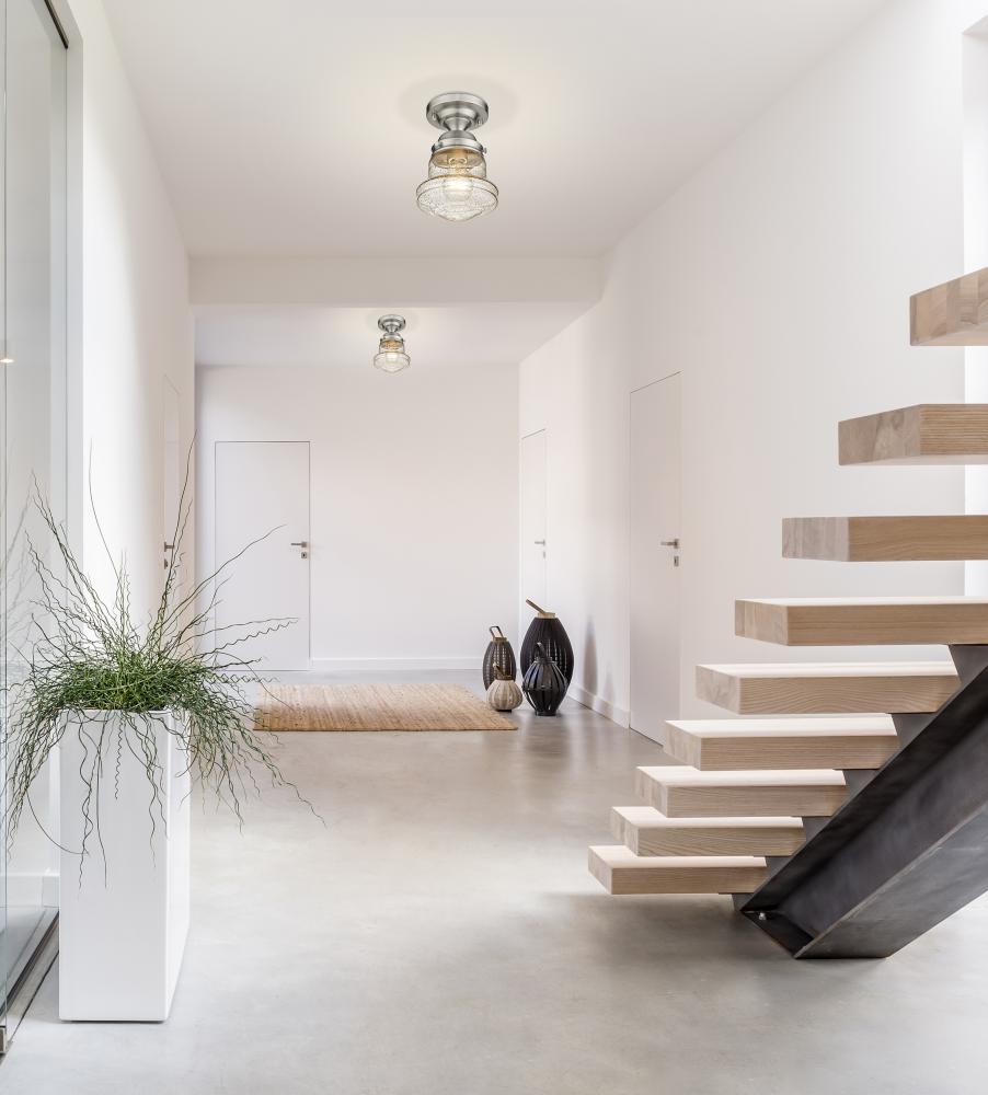 Give your space a modern farmhouse feel or restoration aesthetic with this perfectly sized, petite single light flush mount, designed with a small yet sleek contoured silhouette and a gleaming brushed nickel finish that creates a subtle metallic touch to the space. A perfect addition to a compact apartment foyer or narrow hallway, this Mid-Century Modern-inspired flush mount also offers an artisan quality with a clear seedy glass globe that presents an old-world charm and texture. Mount this small transitional flush mount within a sophisticated yet rustic country setting, elevating the interior with contrasted luxe materials.