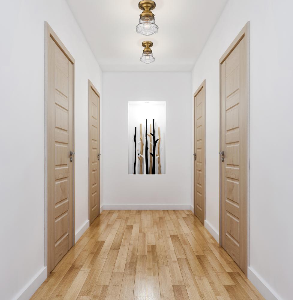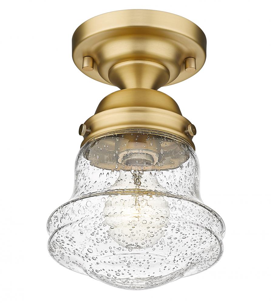 Give your space a modern farmhouse feel or restoration aesthetic with this perfectly sized, petite single light flush mount, designed with a small yet sleek contoured silhouette and a vintage-like heritage brass finish that creates a subtle warm metallic touch to the space. A perfect addition to a compact apartment foyer or narrow hallway, this Mid-Century Modern-inspired flush mount also offers an artisan quality with a clear seedy glass globe that presents an old-world charm and texture. Mount this small transitional flush mount within a sophisticated yet rustic country setting, elevating the interior with contrasted luxe materials.