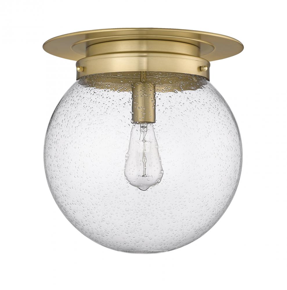 Appreciate the easy feel of a light fixture that works wonders in both contemporary and transitional settings. This one-light flush mount from the Calhoun collection delivers a shapely, symmetrical silhouette with a frame and accents featuring heritage brass finish metal. A delightful clear seedy glass globe shade adds a dose of elegance suitable for any space.