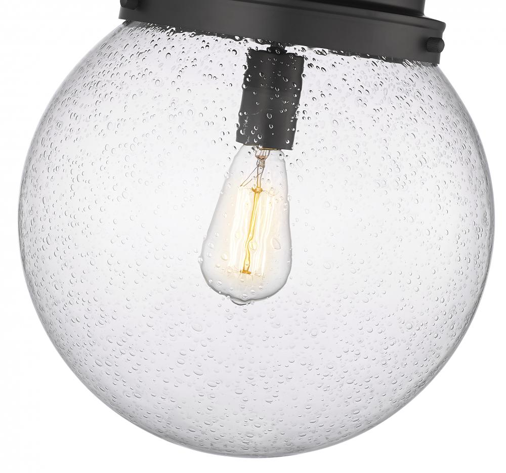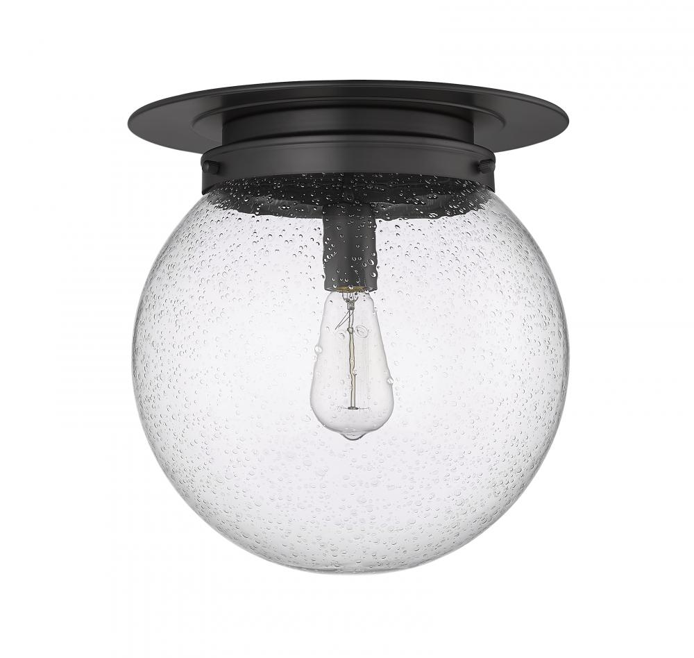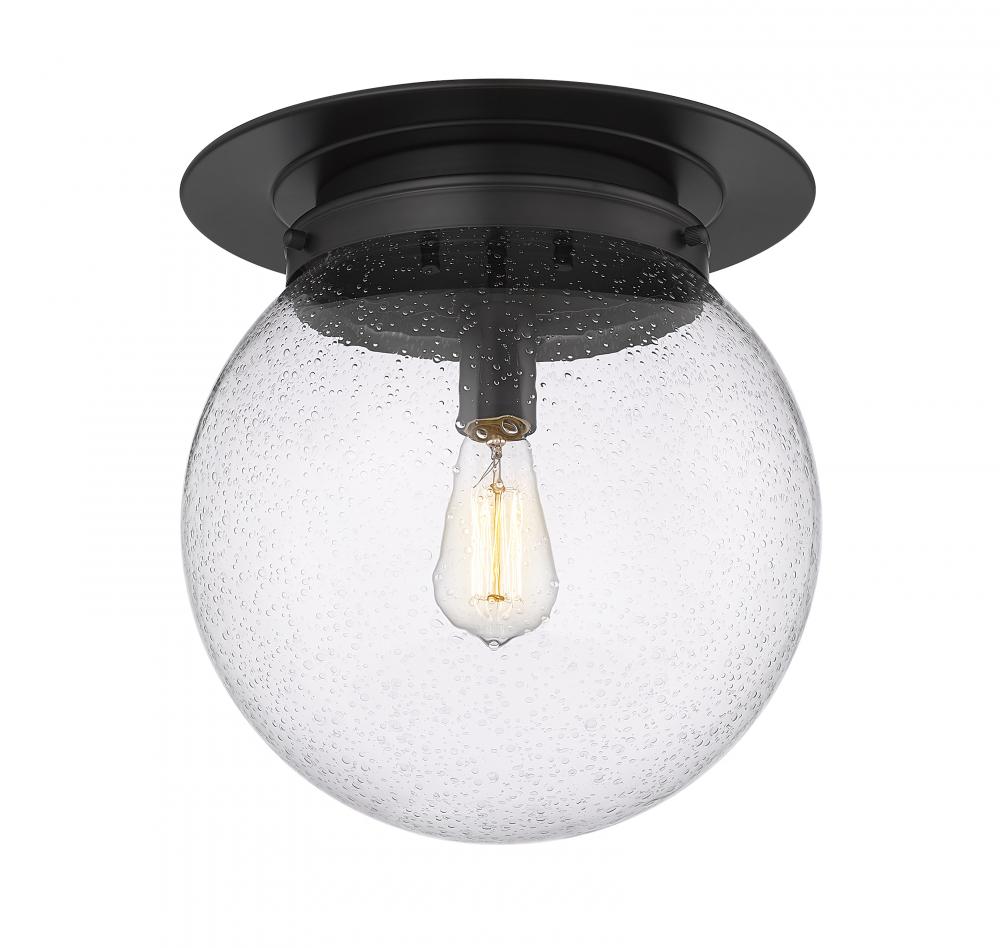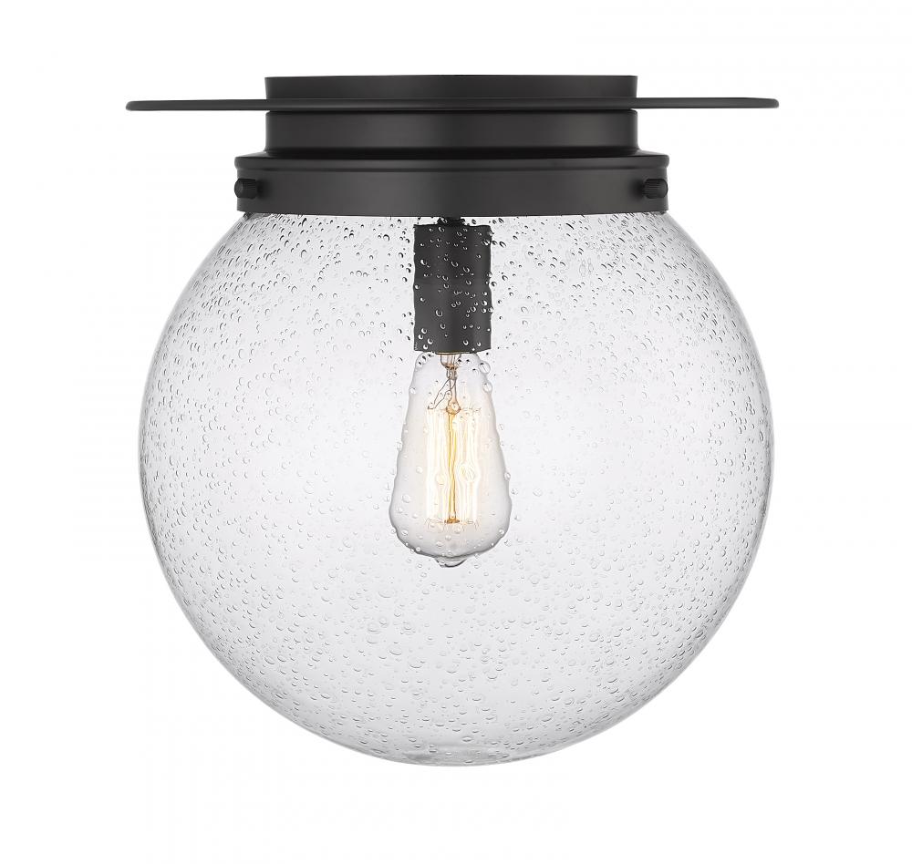 Customize your space with a light fixture blending Mid-Century Modern style with schoolhouse and industrial charm. This one-light flush mount from the Calhoun collection delivers a shapely, symmetrical silhouette with a frame and accents featuring bold matte black finish metal. A festive clear seedy glass globe shade adds a dose of elegance suitable for any application.