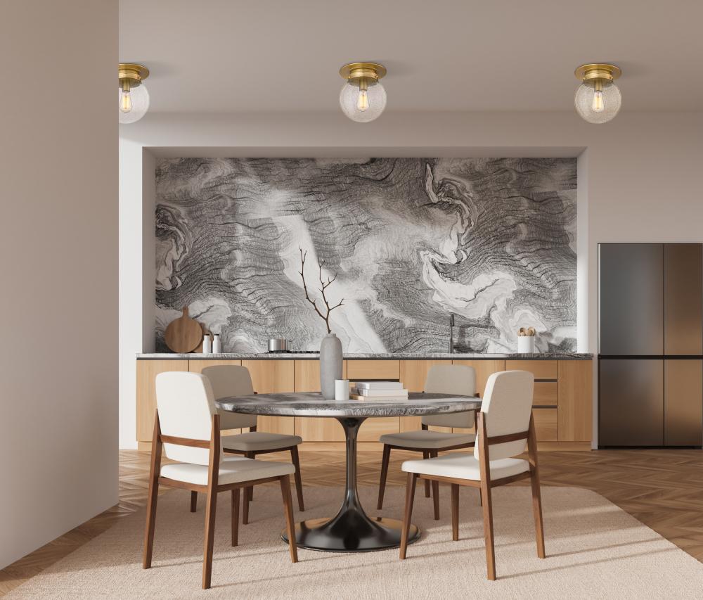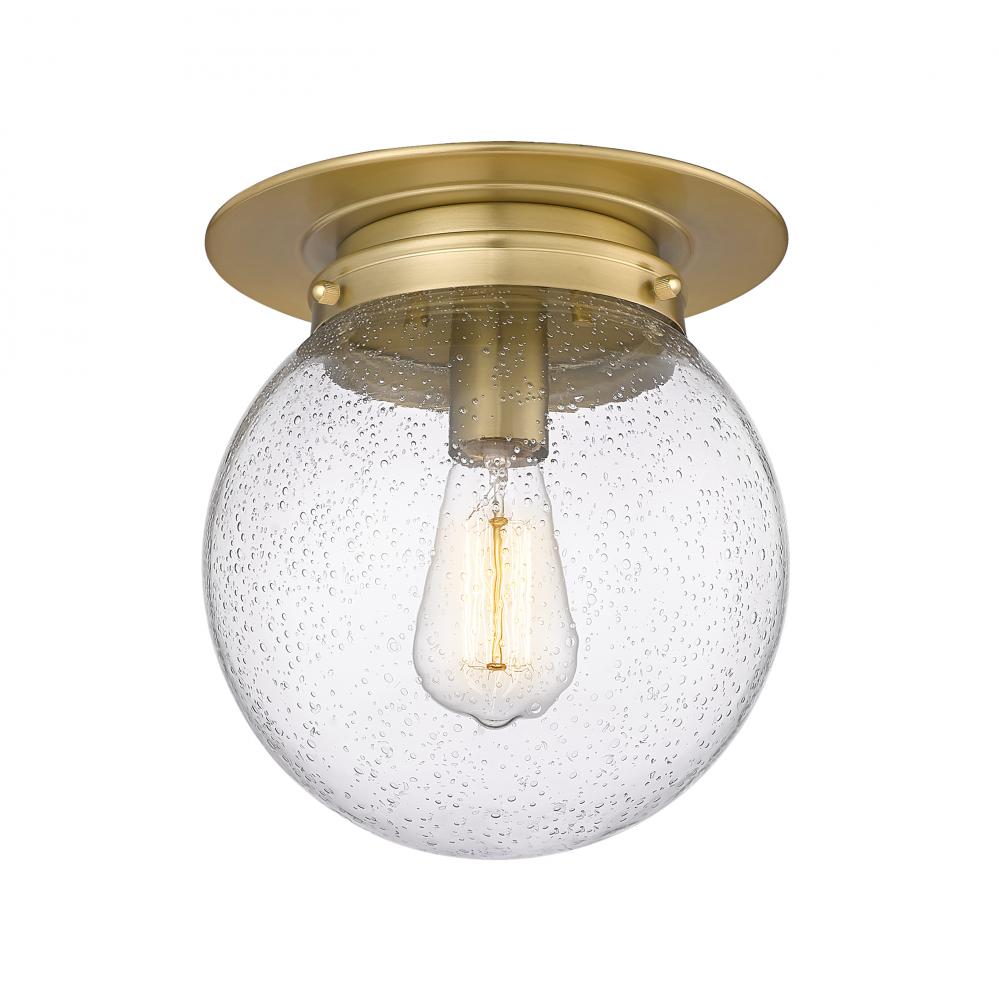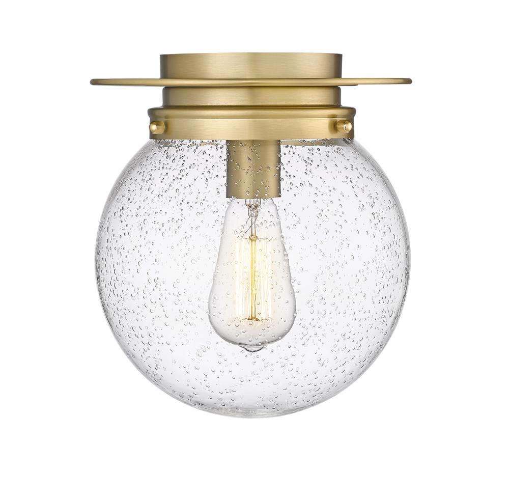From the Calhoun collection comes a one-light flush mount mixing genres between Mid-Century Modern and schoolhouse, both easy on the eyes and versatile. With a warm heritage brass finish metal frame and a delightful clear seedy glass globe, this pendant sheds ambient lighting in any transitional or contemporary space.