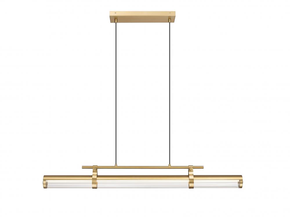 An airy, light presence embellishes the modernist look with deco influence as this single-light linear chandelier makes a design statement. Timeless style sends LED lighting through a clear reeded glass cylinder shade with dimming features, and lifts elegance with its modern gold finish metal framing. Cable suspension and chic accent details offer a new twist in lighting for an updated look.