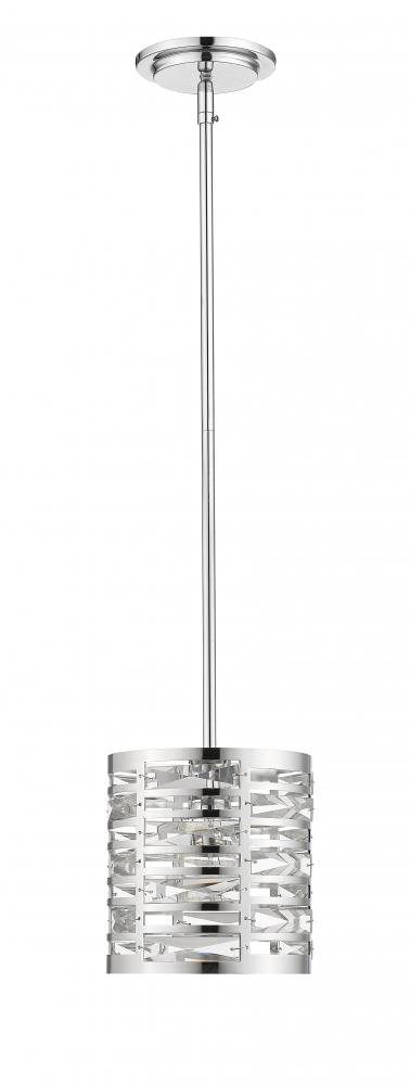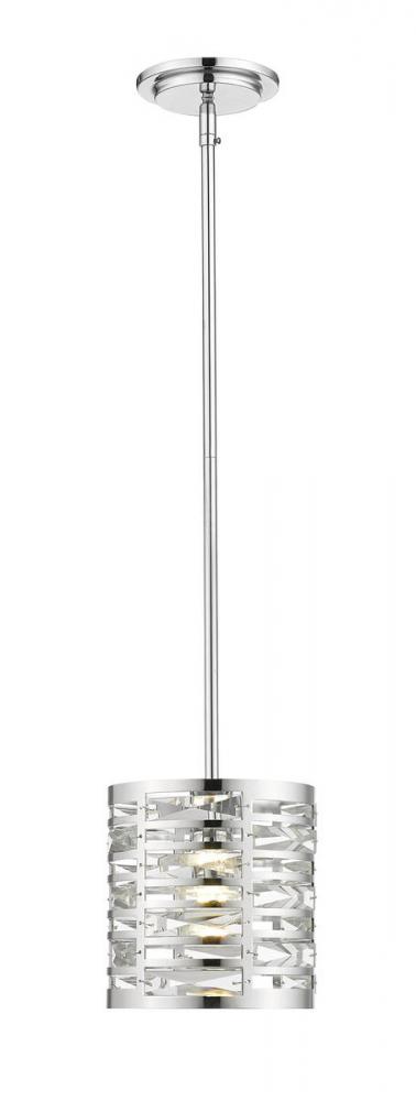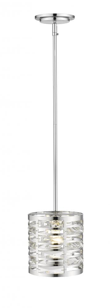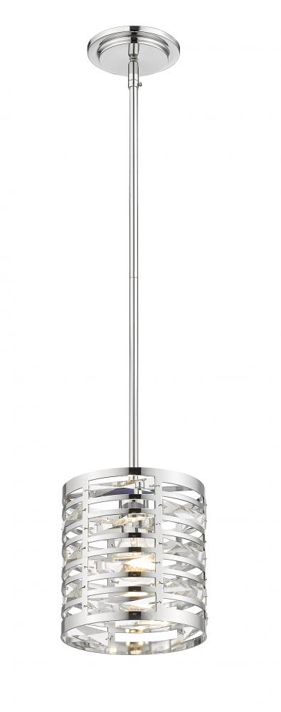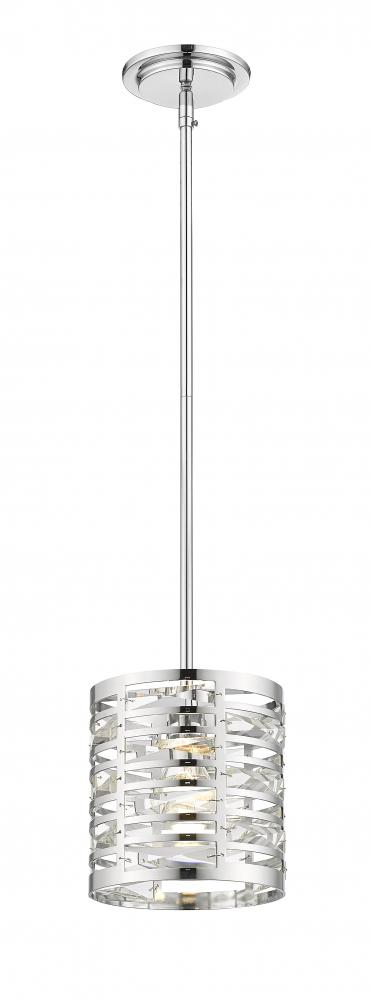 Elongated and eye capturing, this one-light mini pendant features brilliant metallic details. A shiny chrome finish highlights a smooth silhouette, given depth by modern geometric cut outs.
