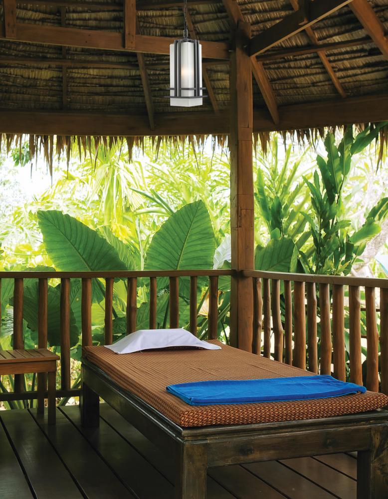 The geometric lines of the Abbey family combine well with contemporary home styling as well as homes in the craftsmen style. This large chain light fixture is made of steel and finished in black with matte opal glass.