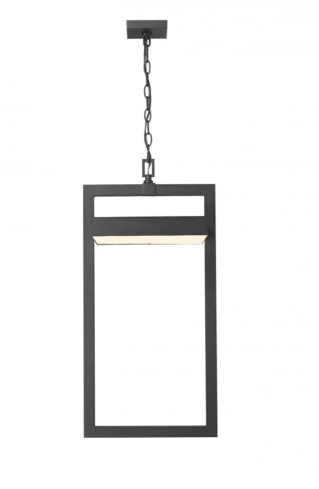 A cutting-edge solution for illuminating your contemporary patio, deck or garden area, this one-light outdoor chain mount ceiling fixture delivers chic minimalism with its angular bold black finish aluminum frame. A sand blast finish white glass shade uses LED-integrated technology to provide a strong, energy-efficient glow to light up evenings outdoors.